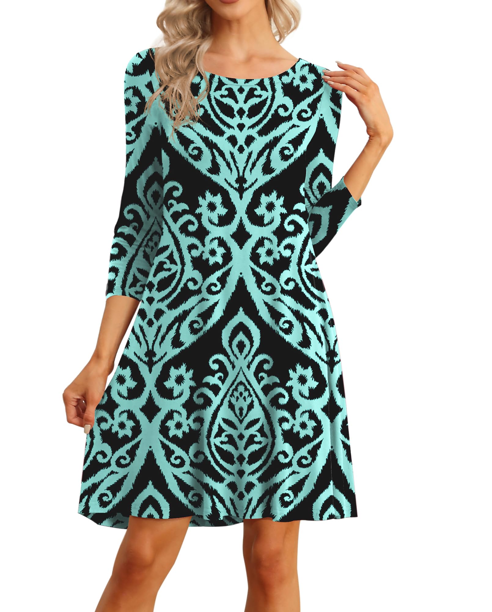 Features: casual basic style, A-line silhouette, 3/4 sleeves/sleeveless ,round neck, super soft.the casual dresses is above the knees and long enough that you wouldn't need to wear leggings with it if you didn't want too.It's a swing style so it would fit comofrtably over large hips.the pockets are such a nice addition,it's loose enough but not baggy.