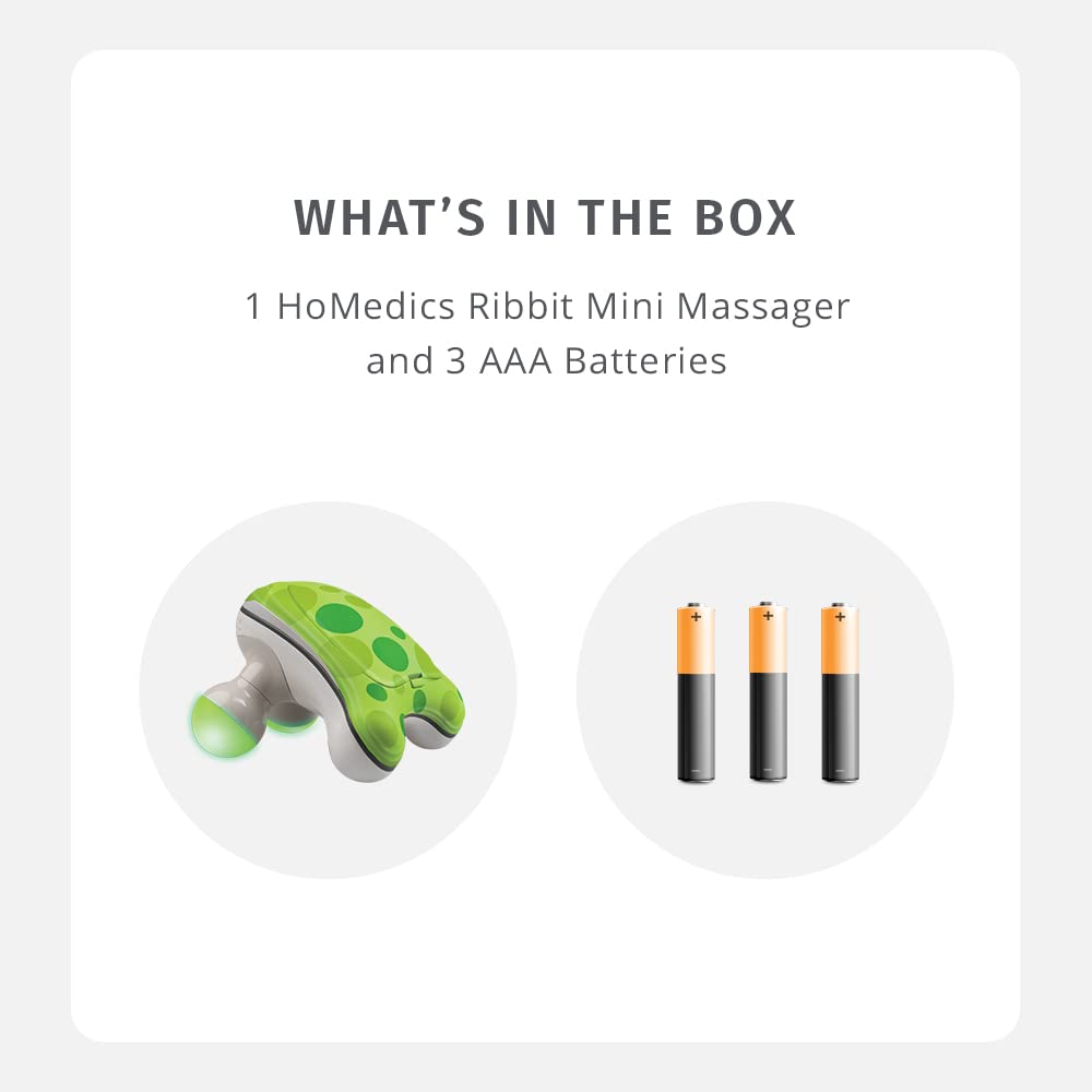 WHAT’S IN THE BOX – 1 HoMedics Ribbit handheld mini massager (of varying color, Green, Blue or Pink) and 3 AAA batteries. This completely wireless and cord-free massager is perfect for on the go.