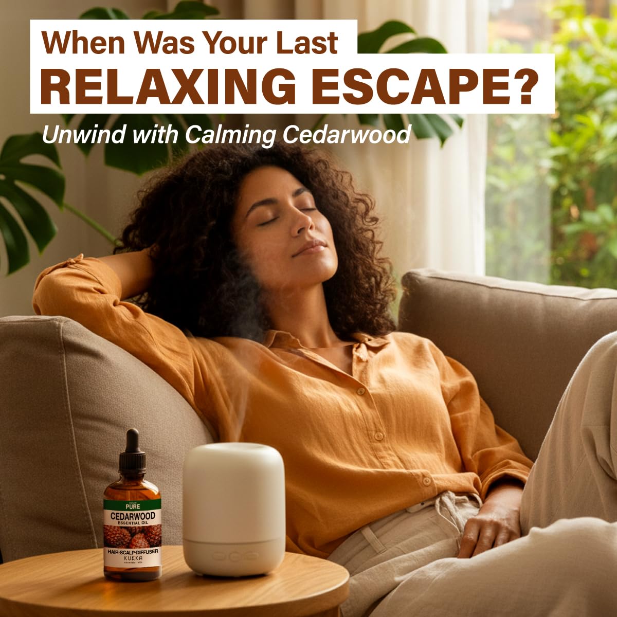 Cedarwood essential oil for diffuser. Transform your space with the calming, relaxing scent of our cedarwood oil. Add 4-5 drops in a cedar oil diffuser for aromatherapy and diffuse for 30 minutes.