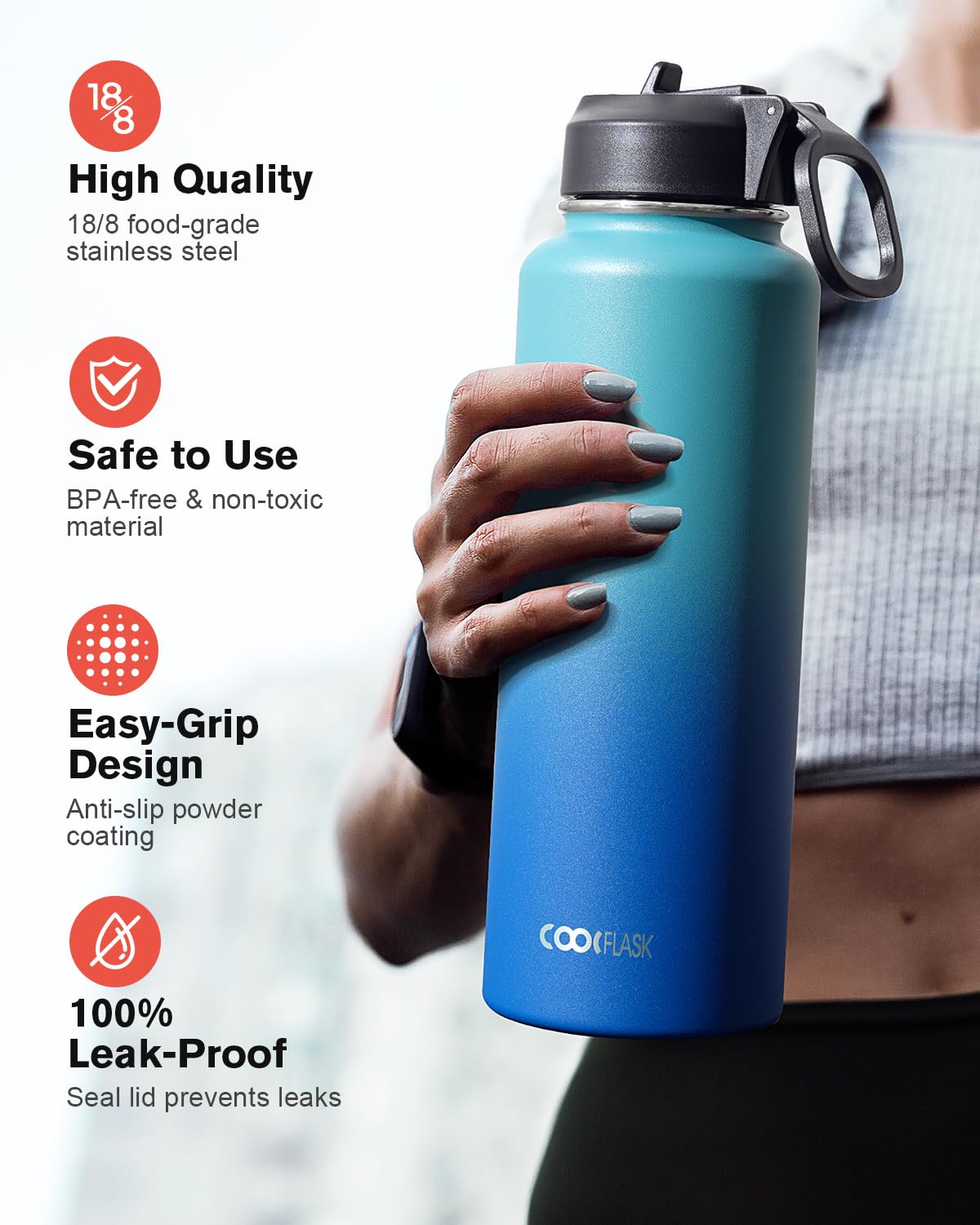 Coolflask Water Bottle 40 oz Insulated with Straw, Stainless Steel Metal 3 Lids Water Flask for Sports or Office, Keep Cold 48H Hot 24H, Indigo Blue