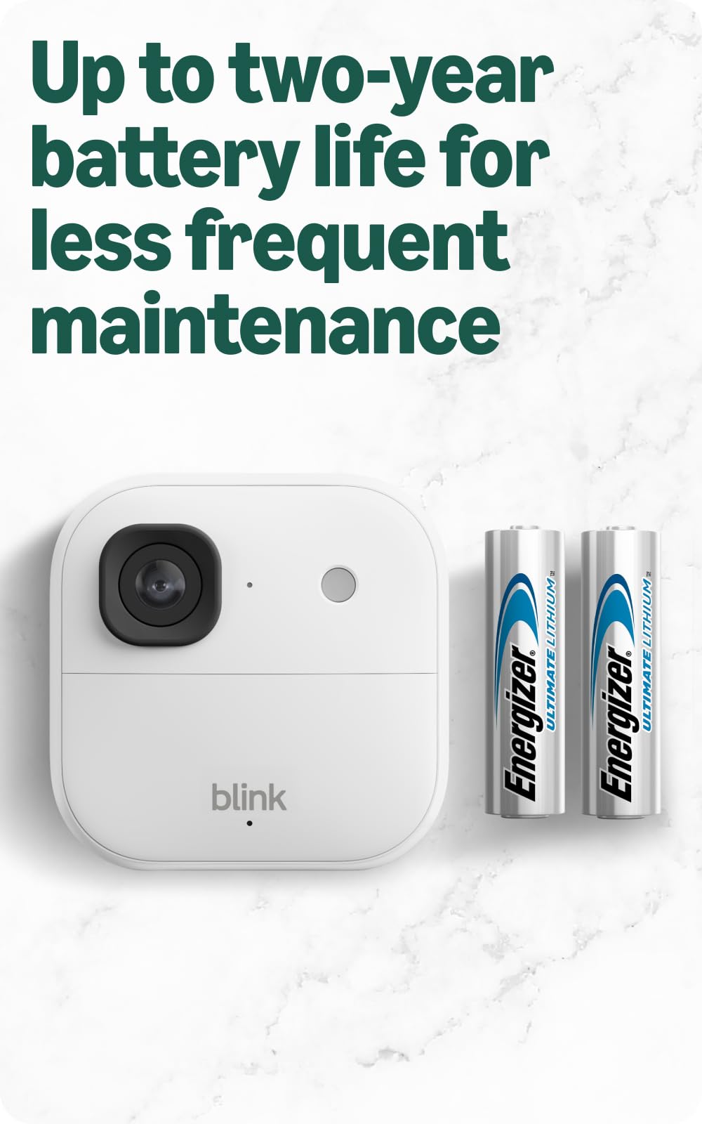 Two-year battery life — Set up in minutes and get up to two years of power with included AA Energizer lithium batteries and a Blink Sync Module (sold separately).