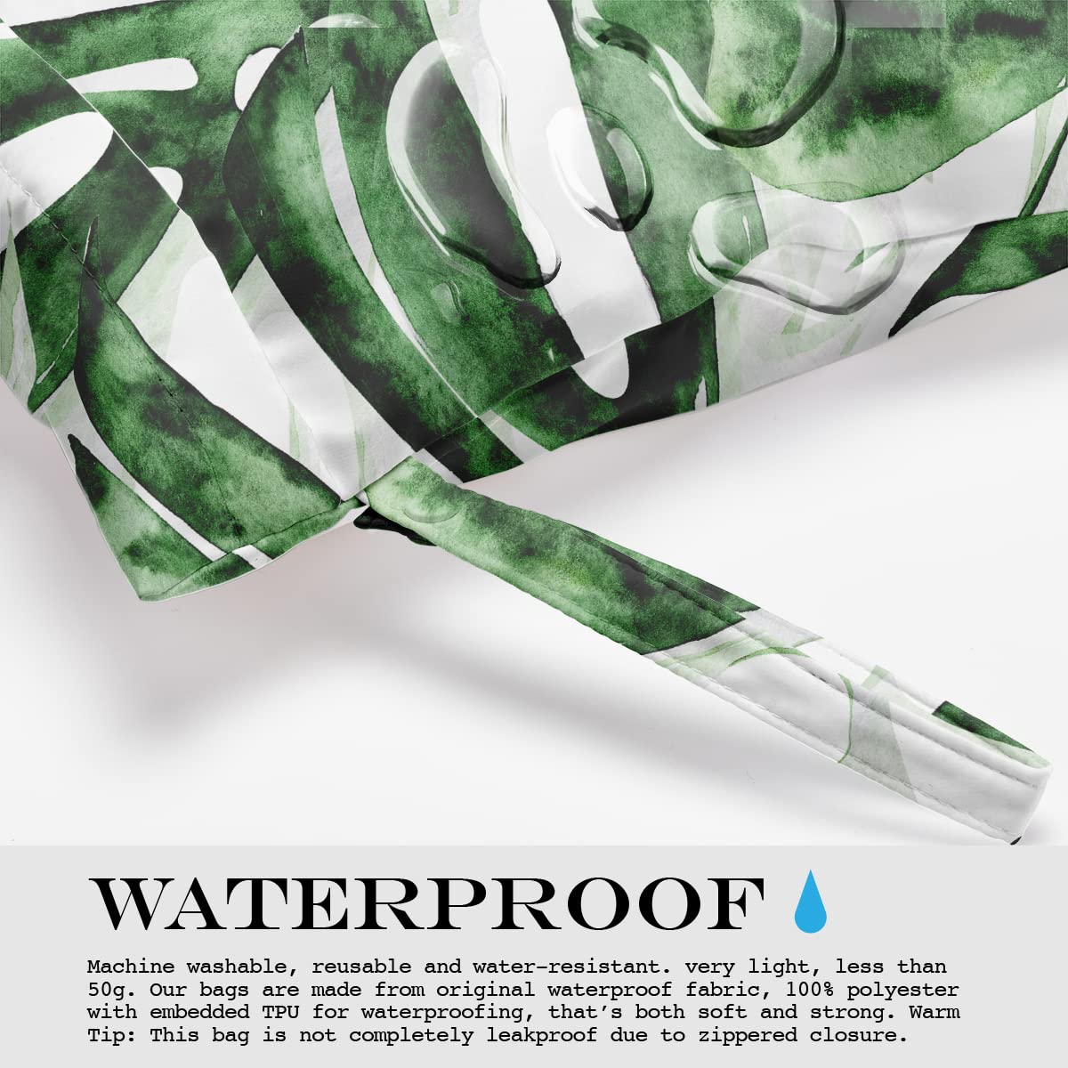 WATERPROOF - Machine washable, reusable and water-resistant. very light, less than 50g. Our bags are made from original waterproof fabric, 100% polyester with embedded TPU for waterproofing, that’s both soft and strong. Warm Tip: This bag is not completely leakproof due to zippered closure.