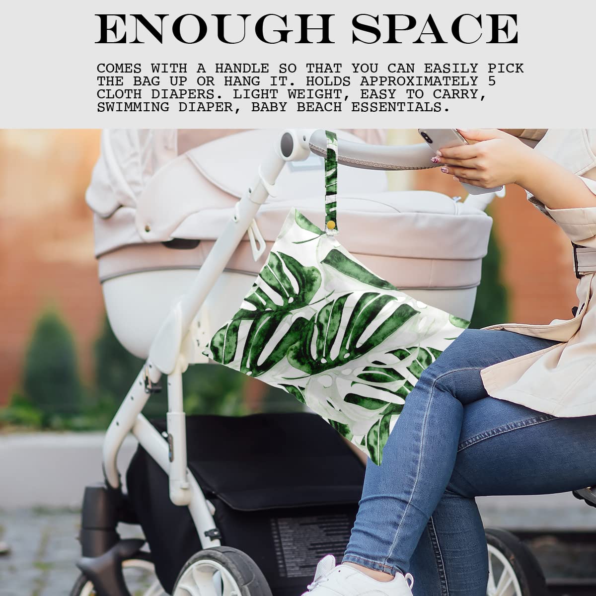 ENOUGH SPACE - 26cm x 32cm (approx.: 12.5” x 10.2”). Comes with a handle so that you can easily pick the bag up or hang it. Holds approximately 5 cloth diapers. Light weight, easy to carry, swimming diaper, beach essentials.