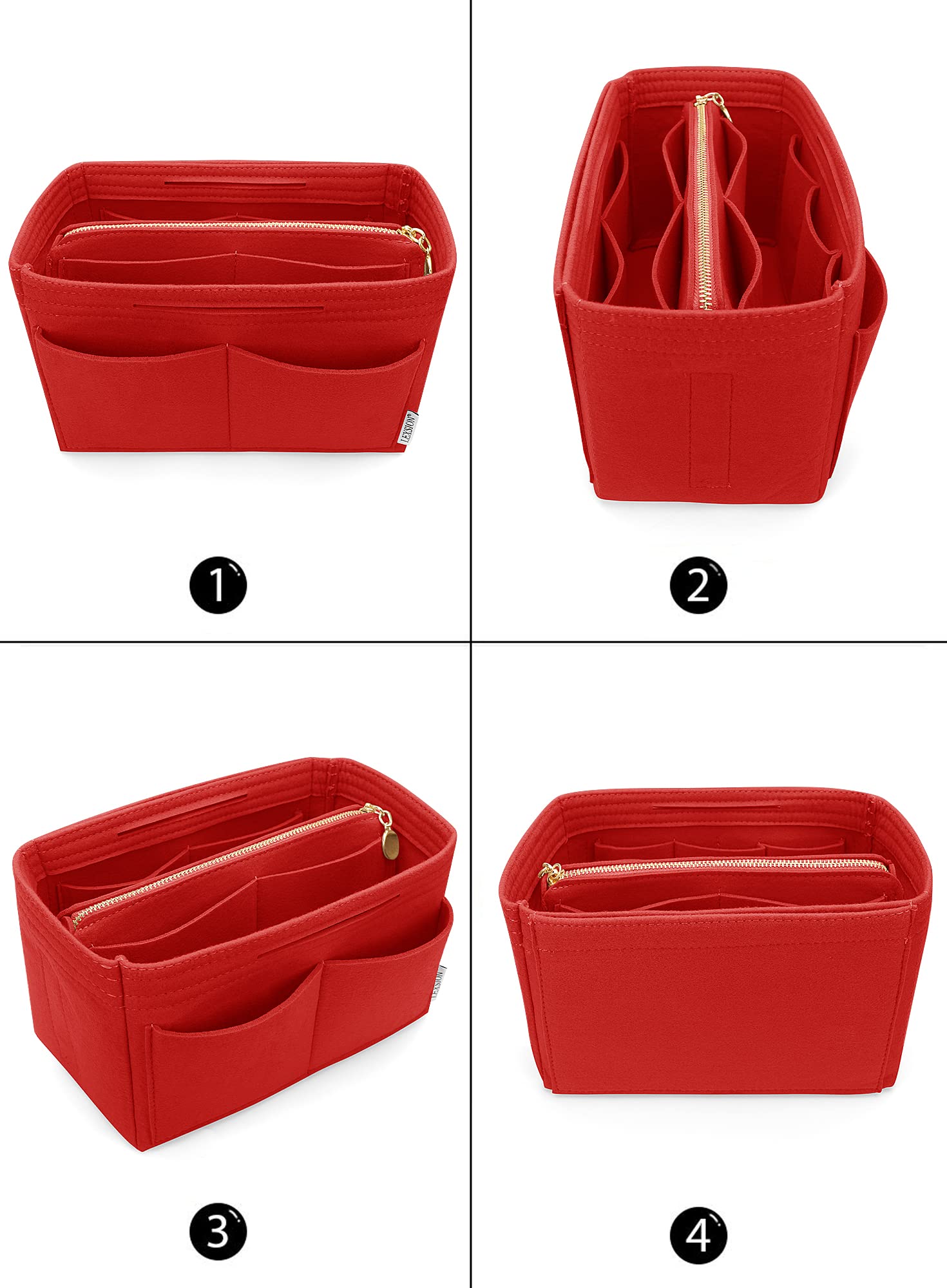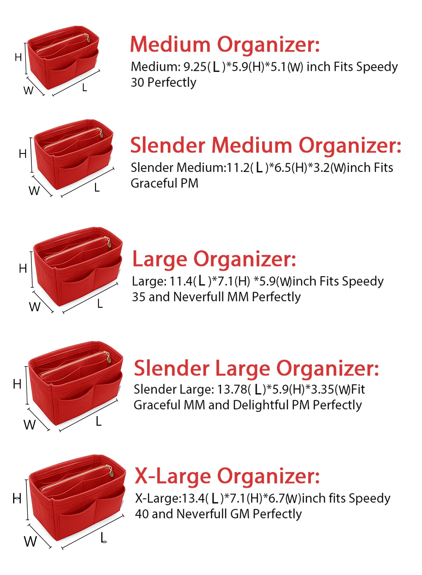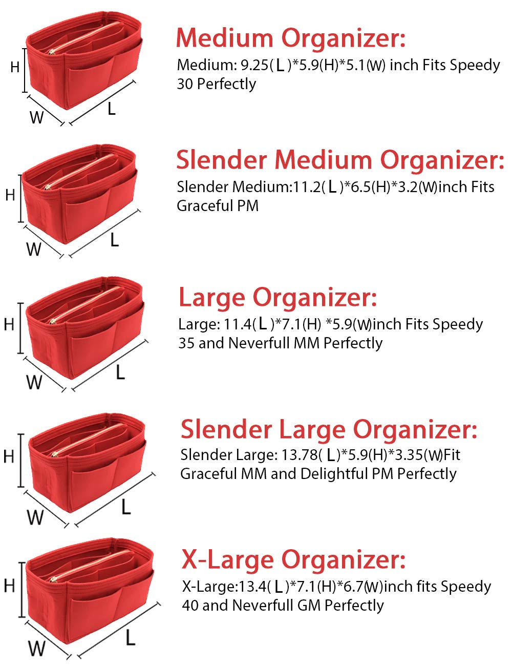 SIZE OF BAG ORGANIZER: Medium: 9.25(L)*5.9(H)*5.1(W) inch Fits Speedy 30 Perfectly. Slender Medium: 11.2(L)*6.5(H)*3.2(W)inch Fits Graceful PM. Large: 11.4(L)*7.1(H) *5.9(W)inch Fits Speedy 35 and Neverfull MM Perfectly. Slender Large: 13.78(L)*5.9(H)*3.35(W)Fit Graceful MM and Delightful PM Perfectly. X-Large:13.4(L)*7.1(H)*6.7(W)inch fits Speedy 40 and Neverfull GM Perfectly. Portable and Compact Purse Perfectly For any Brand.L*H*W means (Length*Height*Width)