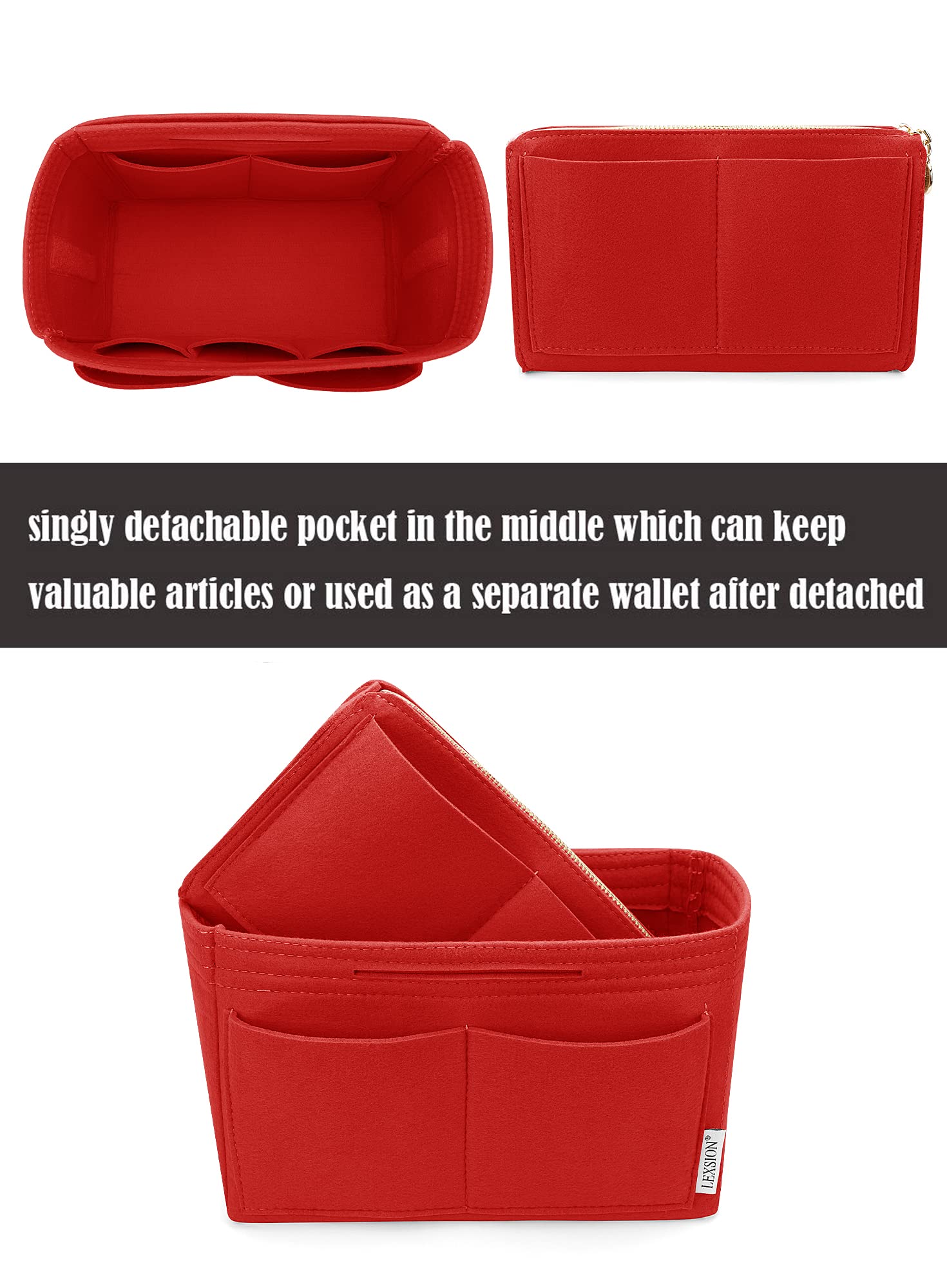 KEEP BAG CLEAN&SHIPSHAPE:13 Pockets Total Purse Organizer,3 exterior pockets, 10 interior pockets with singly detachable pocket in the middle which can keep valuable articles or used as a separate wallet after detached.It keeps everthing neat and well organized shaped.