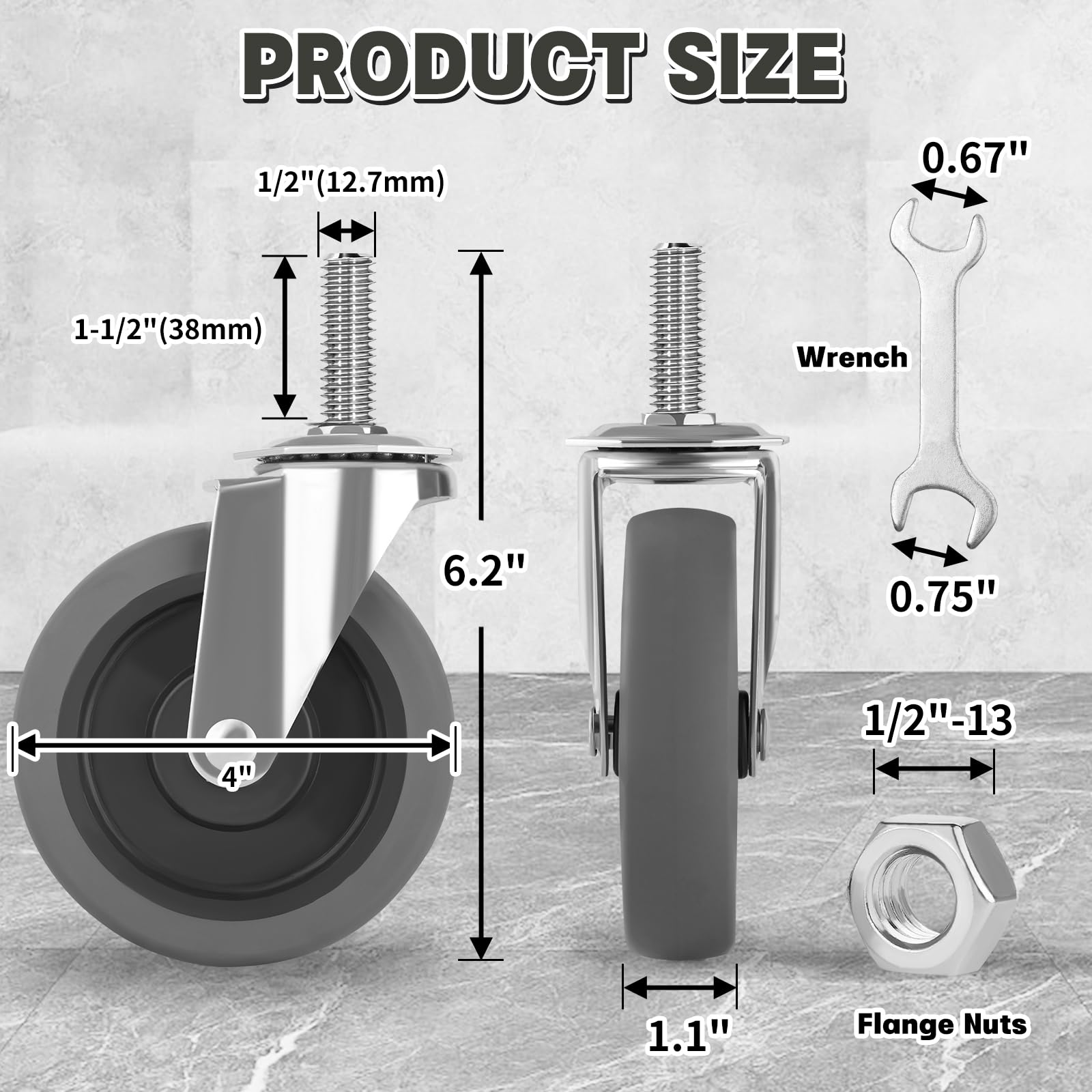 【Cart Wheels 4 inch】4 inch casters set of 4, 1/2"-13 standard course thread and 1-1/2 inches shaft length for quick and secure installation.