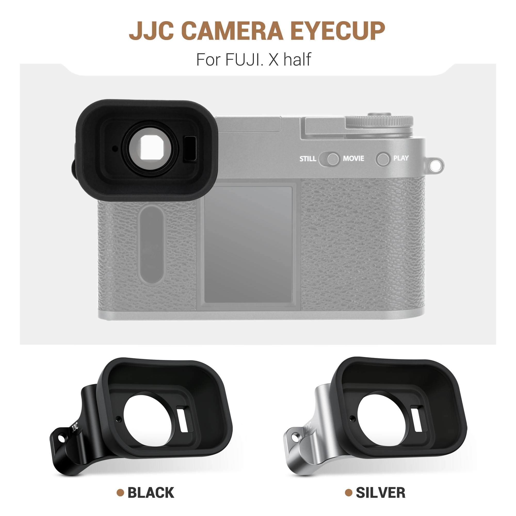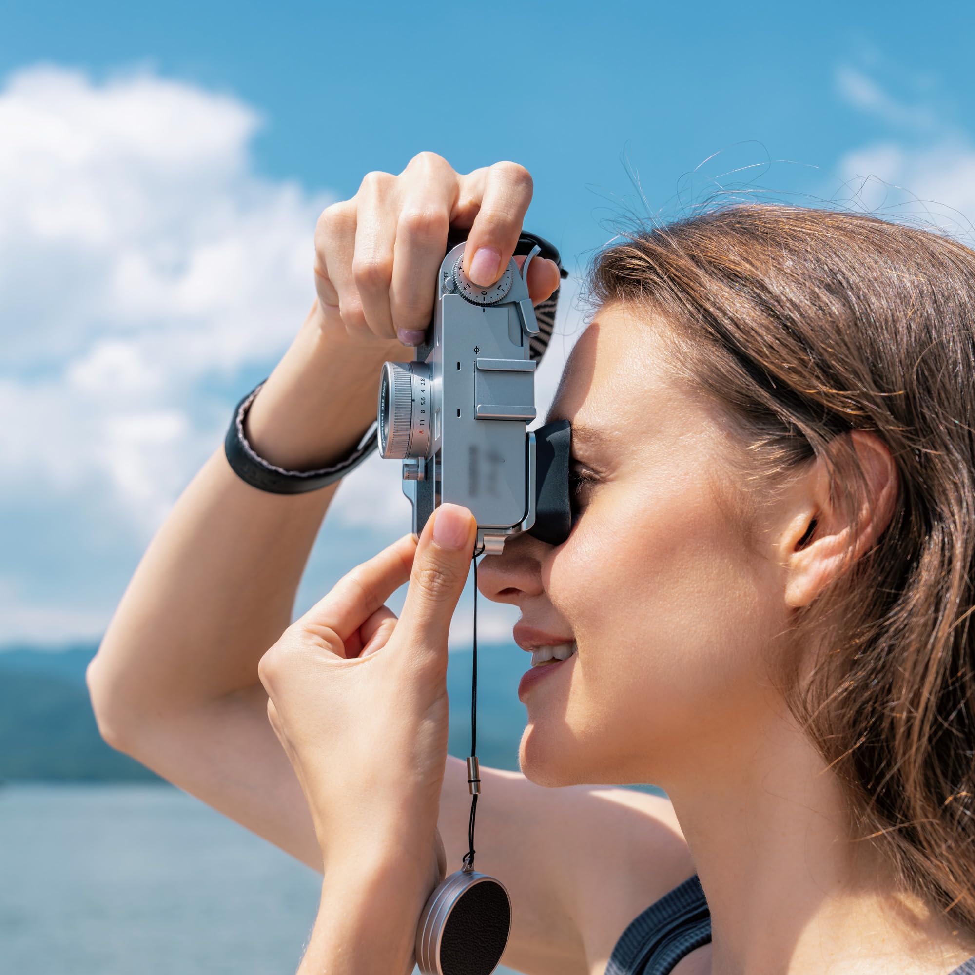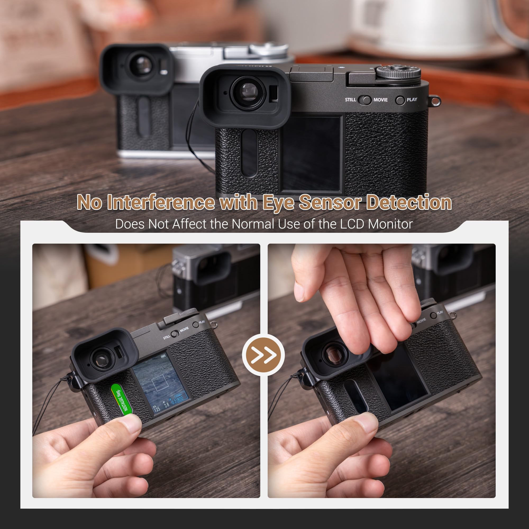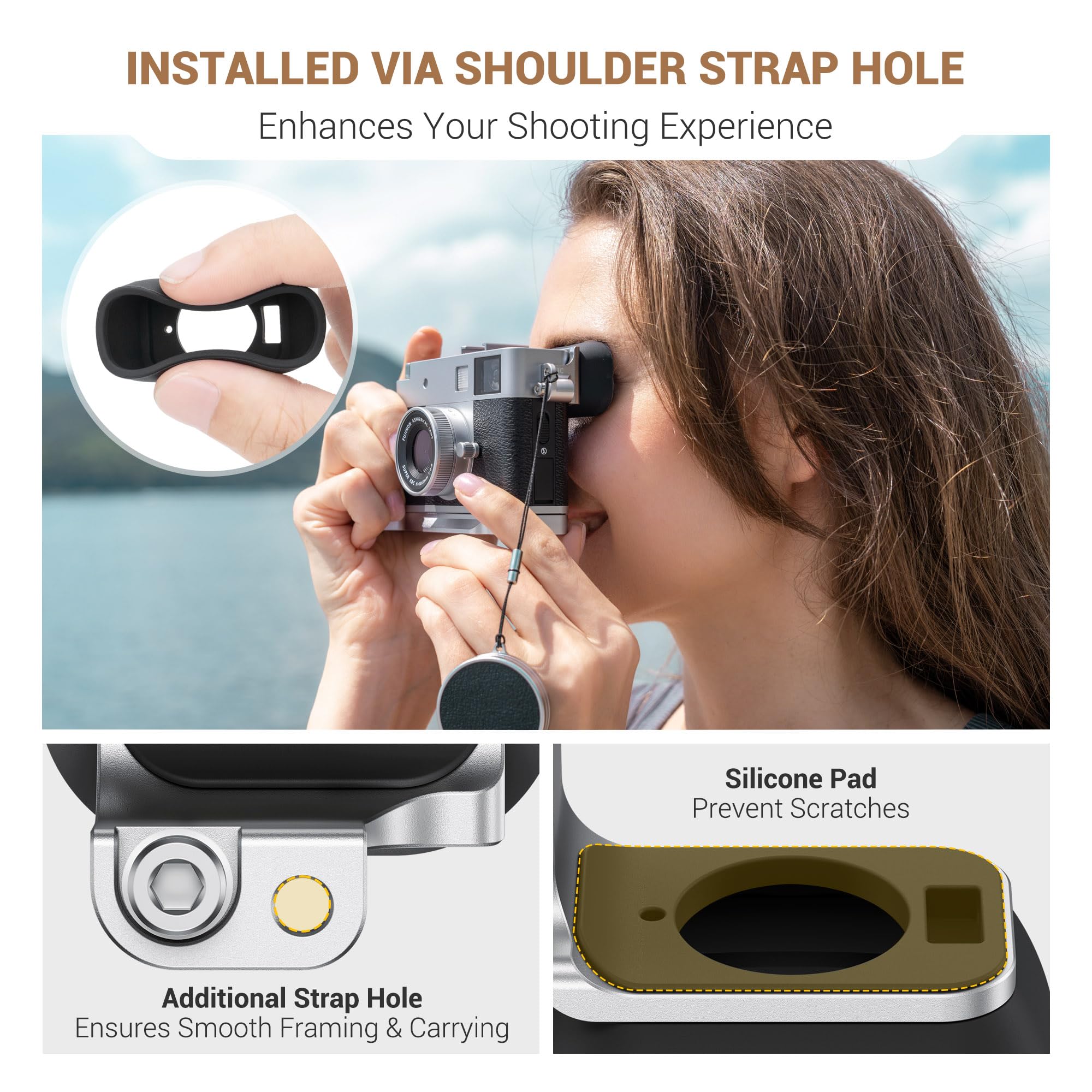 Install via camera’s shoulder strap hole, with an additional hole matching the camera’s strap size. Allows normal strap connection when the eyecup is installed