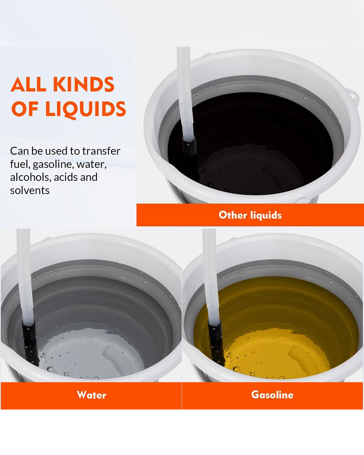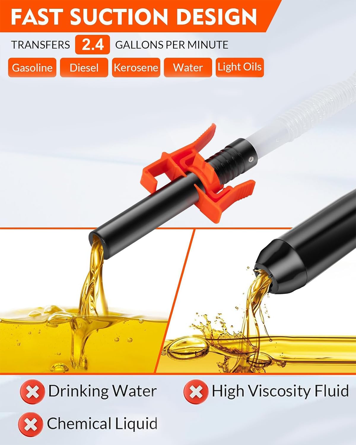 【Versatile Use】:Transfer pump is widely used transfer water ,gas, light oil, kerosene, diesel and more, Suction Tube Length of 16 inch fits 3 to 5 gallon gas cans, Jerrycans, Pail Buckets etc.(Corrosive liquids cannot be transported)
