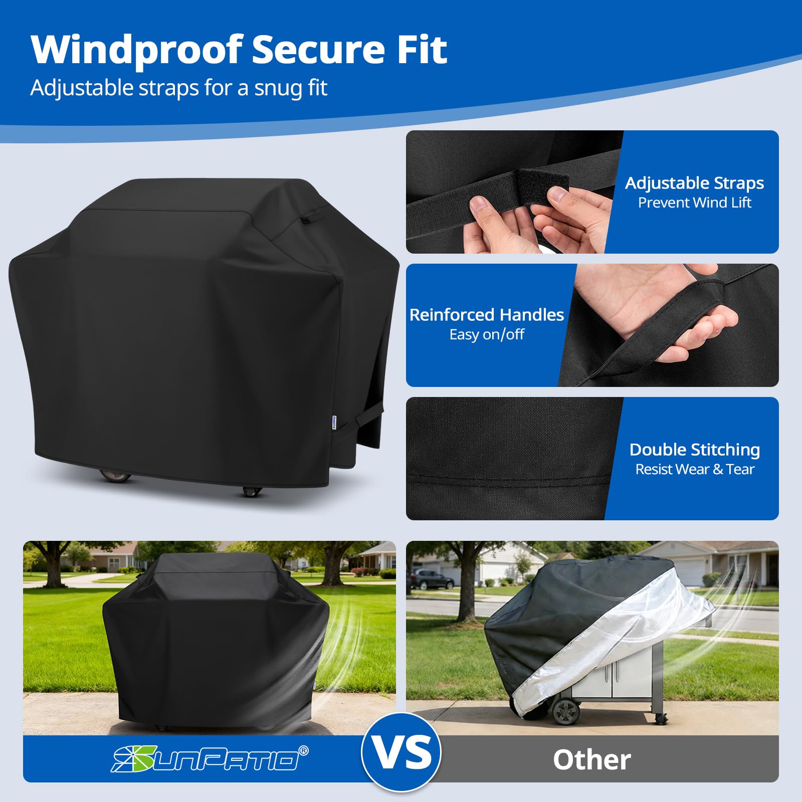 Adjustable Fastening Straps - Two fastening straps at side of the gas grill cover are easy to attach and detach, can be adjusted for a proper fit and keep cover securely in place to prevent the grill cover from blowing away in windy days.