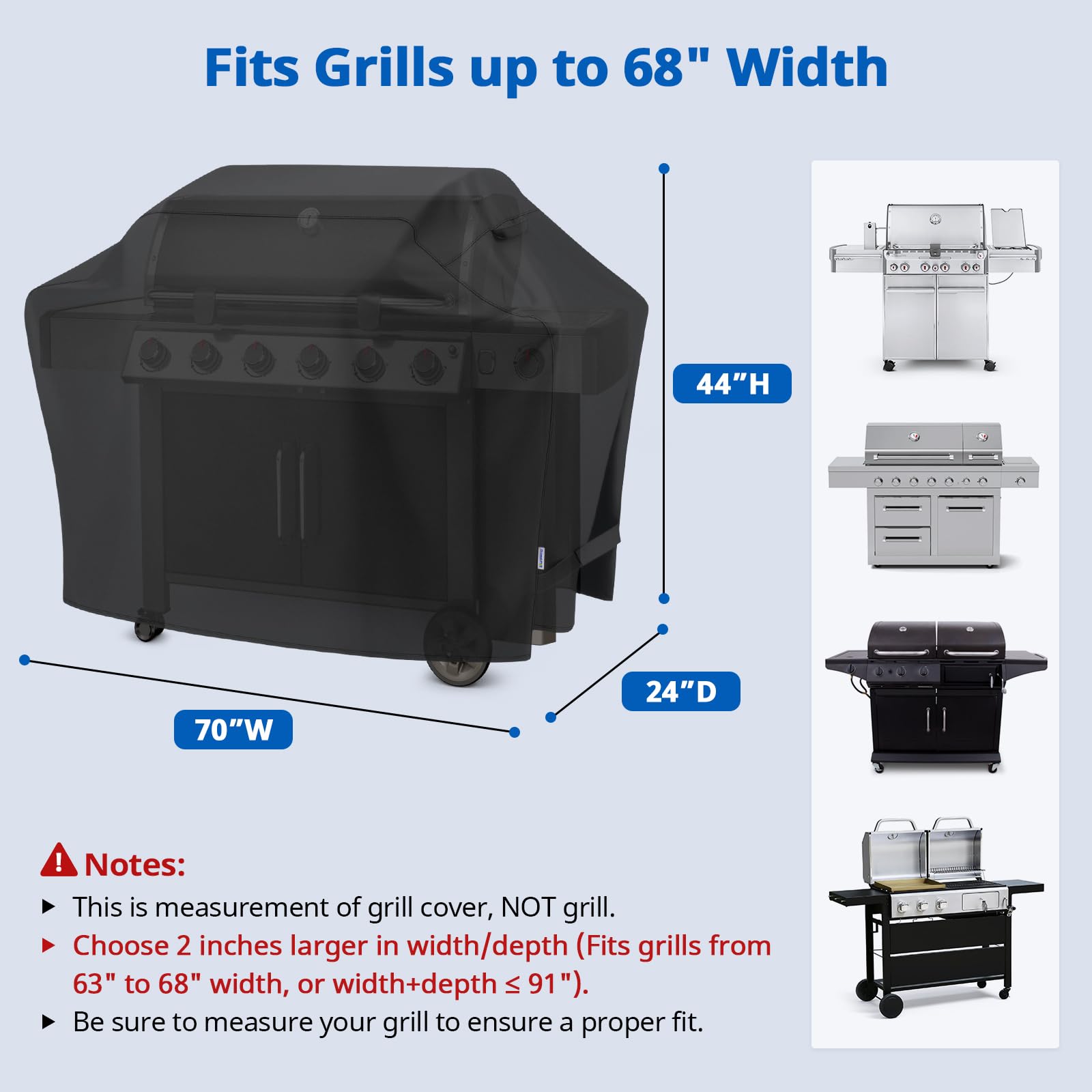 BBQ Cover Dimension - 70"W x 24"D x 44"H, compatible for most large 5-burner and 6-burner gas grills, gas/charcoal, gas/smoker combo BBQ grills in width from 63" to 68", like Weber Charbroil Kenmore Nexgrill and so on. Be sure to measure your grill size before purchasing and choose a fitting cover with space to spare.
