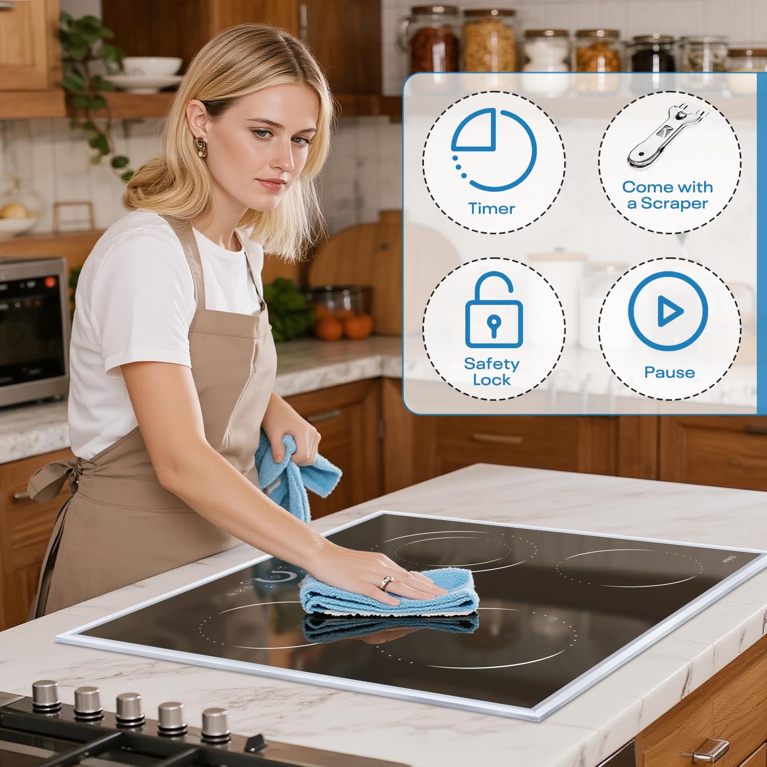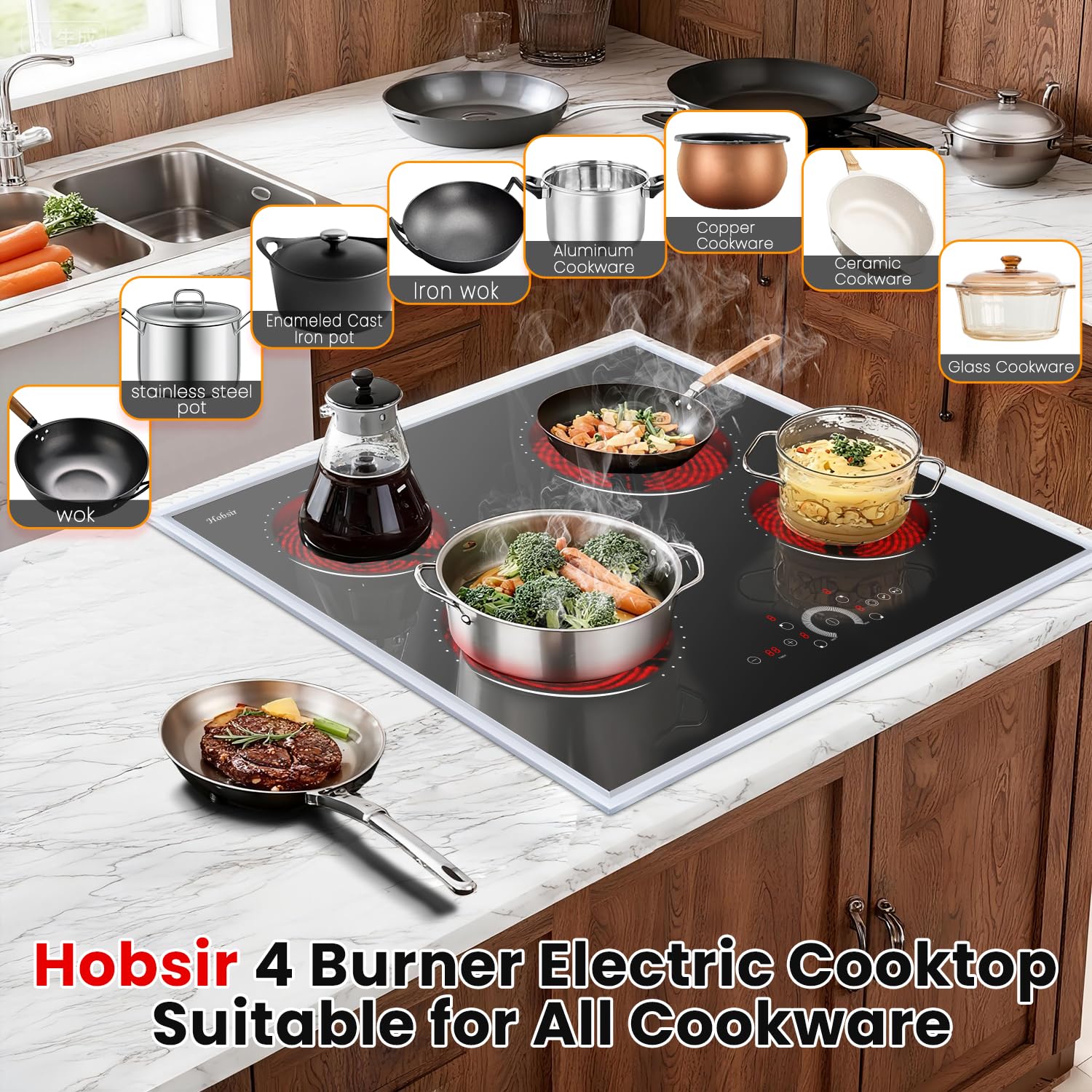【Universal Compatibility with All Cookware】Unlike induction cooktops, this electric cooktop works with any flat-bottomed pot or pan—stainless steel, cast iron, glass, ceramic, and more. No need to replace your favorite cookware! The sleek ceramic surface is easy to clean and complements modern kitchens.