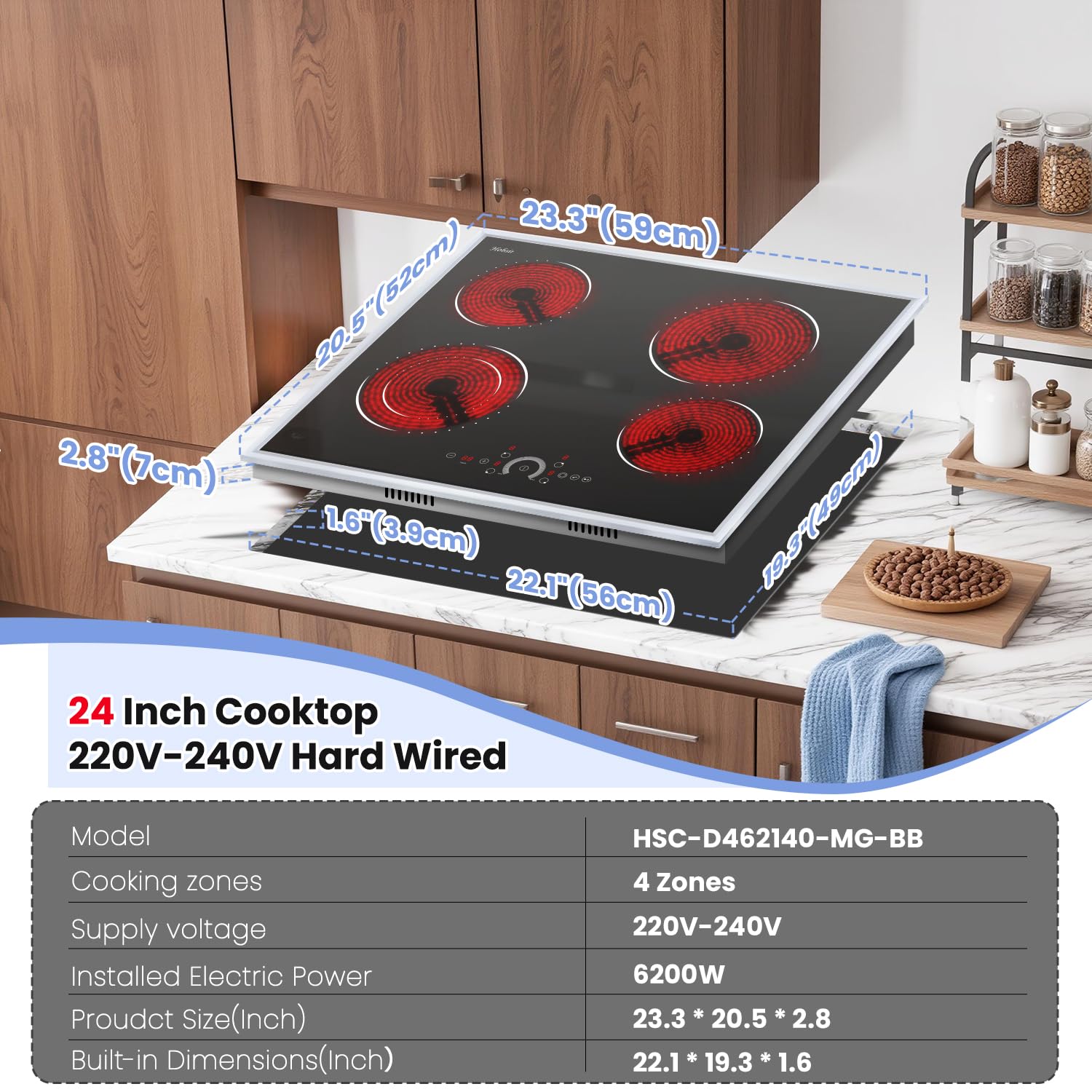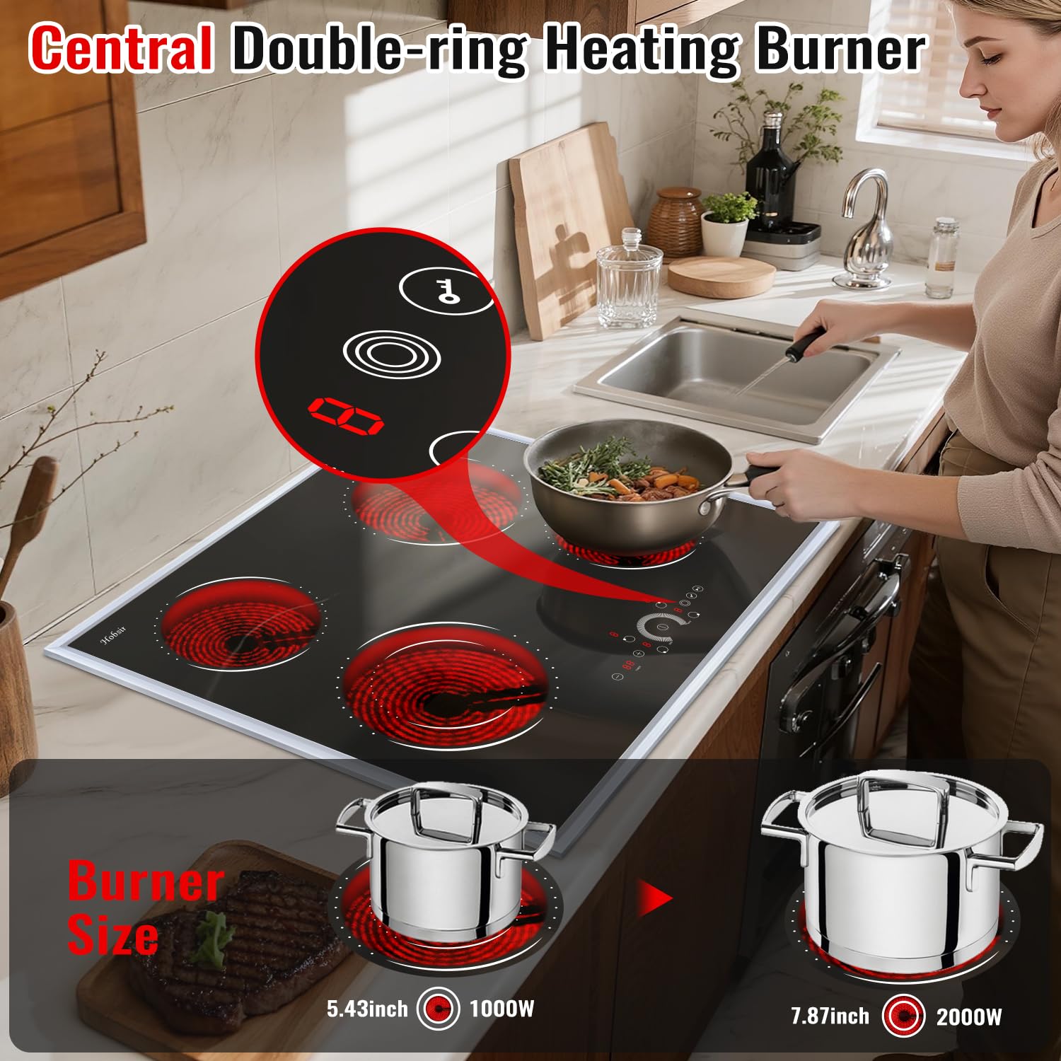 【High-Power 6200W Performance with Flexible Cooking Zones】Experience exceptional cooking power with a total output of 6200W. This 24-inch electric cooktop features four versatile burners: two 1200W zones for simmering and moderate heat, one 1800W burner for rapid boiling, and a dual-ring burner (5.43" inner ring: 1000W / 7.87" outer ring: 2000W) that adapts to small and large cookware. Perfect for everything from delicate sauces to searing.