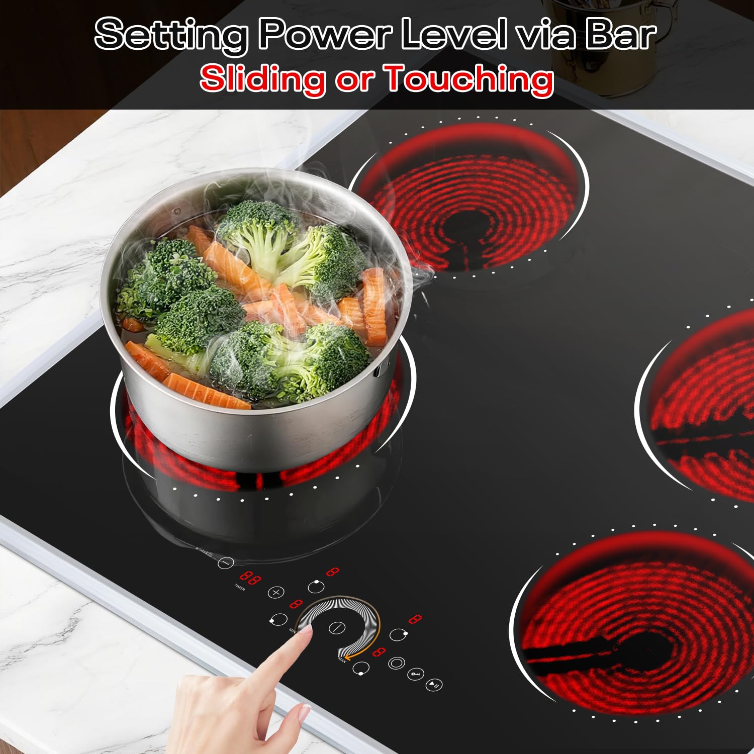 【9-Level Smooth Power Control for Precision Cooking】Achieve perfect results with nine precise power levels. The smooth rotary knobs allow seamless adjustment from low simmer to high heat, giving you ultimate control over every dish. Whether melting chocolate or frying at high temperatures, this electric stove top delivers consistent, accurate heat.