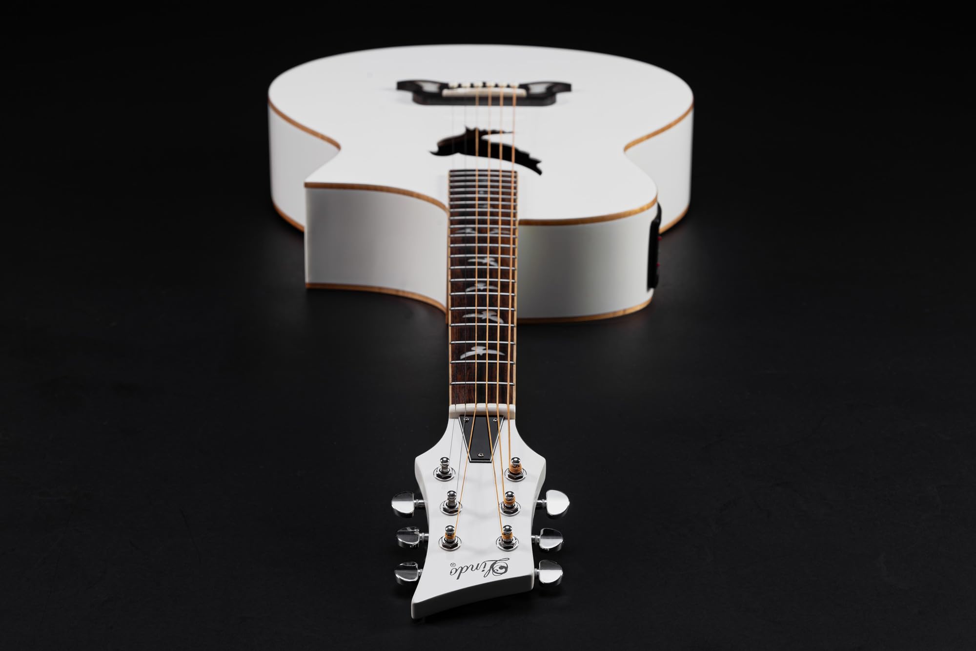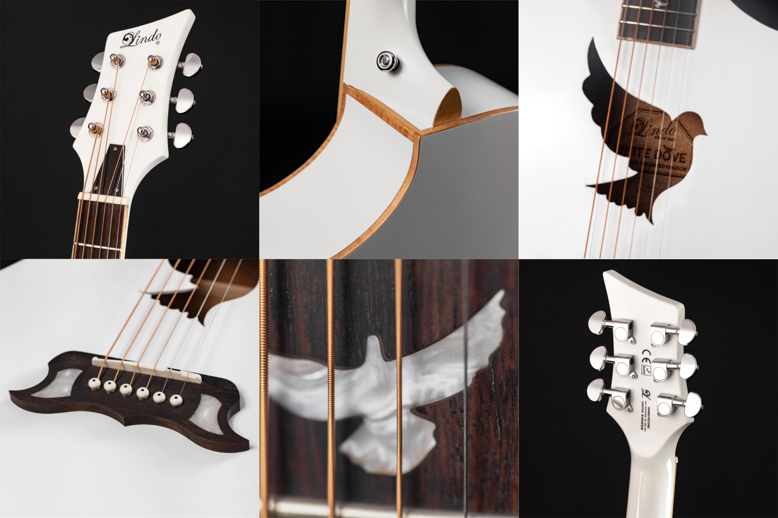LINDO WHITE DOVE V3 – DESIGNED IN BRISTOL, UK BY LINDO GUITARS Unleash your inner peace and divinity with the White Dove. This exquisite instrument was designed to break free from the mundane and traditional, offering a unique blend of style and substance. With its stunning White Dove design, this guitar is a true work of art that is sure to turn heads and captivate audiences. But it’s not just a pretty face – the Lindo White Dove V3 delivers exceptional sound quality and tone that is second to none. So why settle for an ordinary guitar when you can have one that truly stands out from the crowd? Experience the ultimate in style and sound with the Lindo White Dove V3. Indulge your senses with the stunning Lindo White Dove V3 electro acoustic guitar. Adorned with an alluring pearl white gloss finish and a unique dove sound-hole, this guitar is a true masterpiece. The laurel bridge and fretboard not only enhance the guitar’s aesthetics but also contribute to its exceptional tonality. The ornate solid laurel bridge, dove-in-flight inlays, and natural wood binding add a touch of elegance to this already mesmerizing instrument. Crafted with a spruce top, sapele wood sides and back, and a mahogany neck with a slim c-shape, this guitar produces solid bass notes and bright, pleasant mids and trebles. With access to all 20 frets, the cutaway body provides ultimate comfort and playability. The TOPS-4T preamp includes a built-in chromatic tuner and 4-band EQ, so you can customize your sound with ease and accuracy. The master volume control and low battery indicator add to the convenience of this guitar, making it perfect for any performer on-the-go. With the 1/4″ Jack and XLR outputs, you can connect to an amplifier, external PA system, or recording/mixing desk and enjoy enhanced signal quality. This dual output feature ensures you can expand your sound and reach a wider audience without compromising on sound quality. Crafted with exquisite attention to detail, the Lindo White Dove V3 is an appealing and versatile instrument suitable for players of all levels. With its stunning appearance, exceptional sound quality, and unrivaled versatility, this guitar is the ultimate choice for any musician looking to take their playing to the next level. The White Dove features a unique headstock design that showcases the Lindo custom machine heads with chrome finish. These diecast tuners are not only reliable but also offer an fine gear ratio for exceptional stability and precision tuning. And with their sleek chrome finish, they add a touch of elegance to this already gorgeous instrument. You won’t have to worry about tuning issues or compromising on style with the Lindo White Dove V3. At Lindo Guitars, we take pride in every guitar we sell. Our dedicated guitar technician meticulously sets up each instrument to ensure that every detail is perfect, from the truss rod adjustment to the perfect action. This means that when your guitar arrives, it will be ready to play straight out of the box, with only a quick tune-up required. We believe that you should be able to focus on playing and making beautiful music, without having to worry about the technicalities. So rest assured, with a Lindo Guitar, you’re not just buying an instrument. You’re investing in quality, care, and attention to detail.