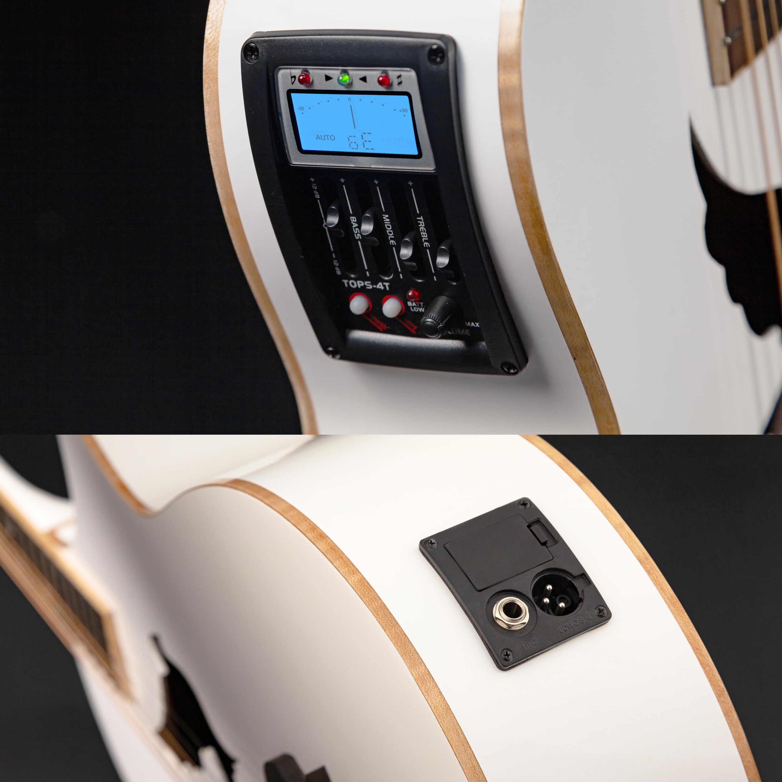 Integrated TOPS-4T active preamplifier unit with with piezoelectric pickup (under-saddle) | 4-band Equaliser (Bass, Middle, Treble and Presence) with master volume | Backlit LCD and digital tuner interface (auto and manual modes) | Allows connection to an amplifier or recording gear as well as providing tuning on-the-go! | Dual XLR and Jack Output