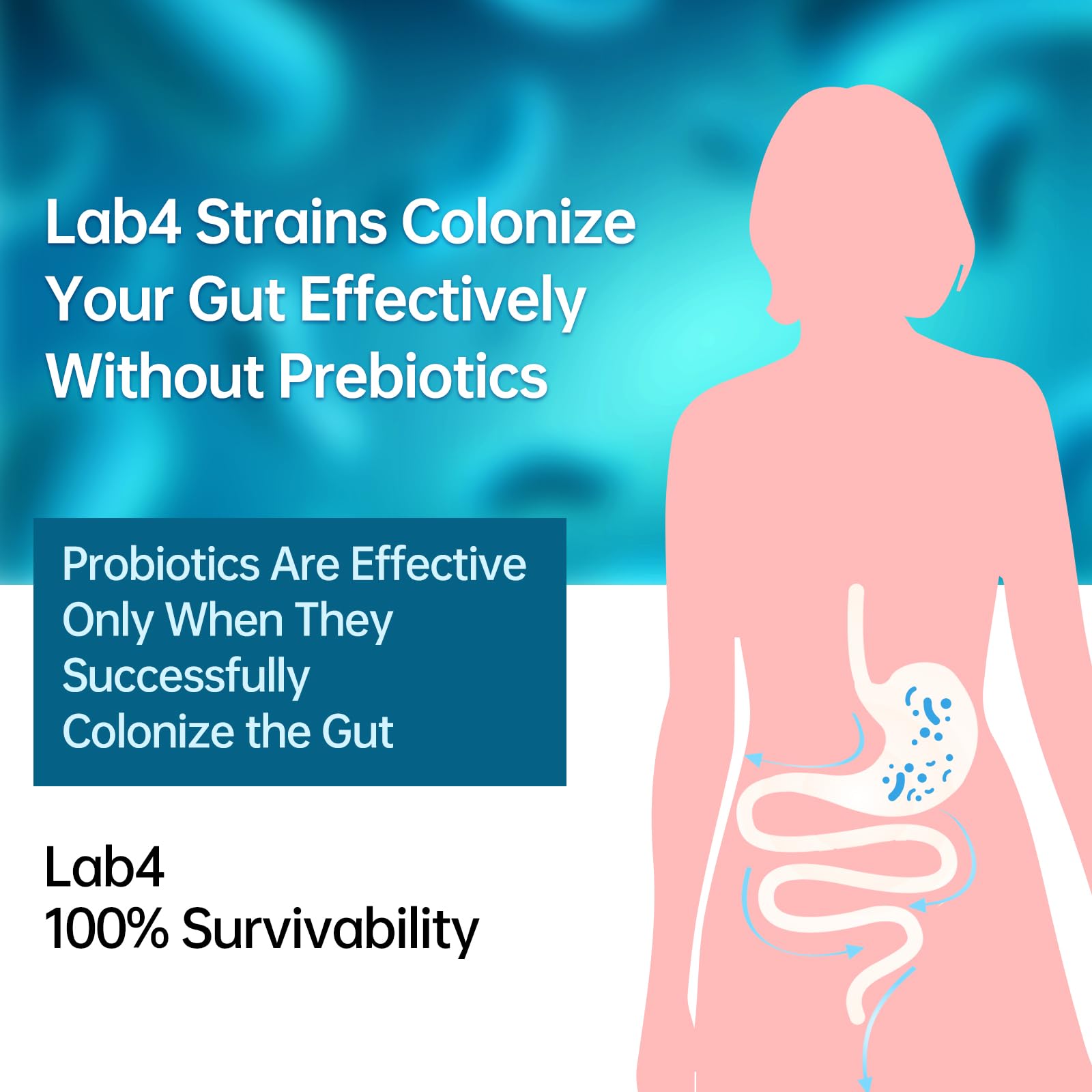 MAXIMUM ABSORPTION & STOMACH ACID SURVIVAL: Most probiotics die in stomach acid before they even start working. Lab4 strains are clinically validated by Cardiff University to survive the harsh gastric environment and are specifically designed to effectively colonize your gut - without the need for prebiotics. TriPhase technology helps deliver maximum benefits where you need them most