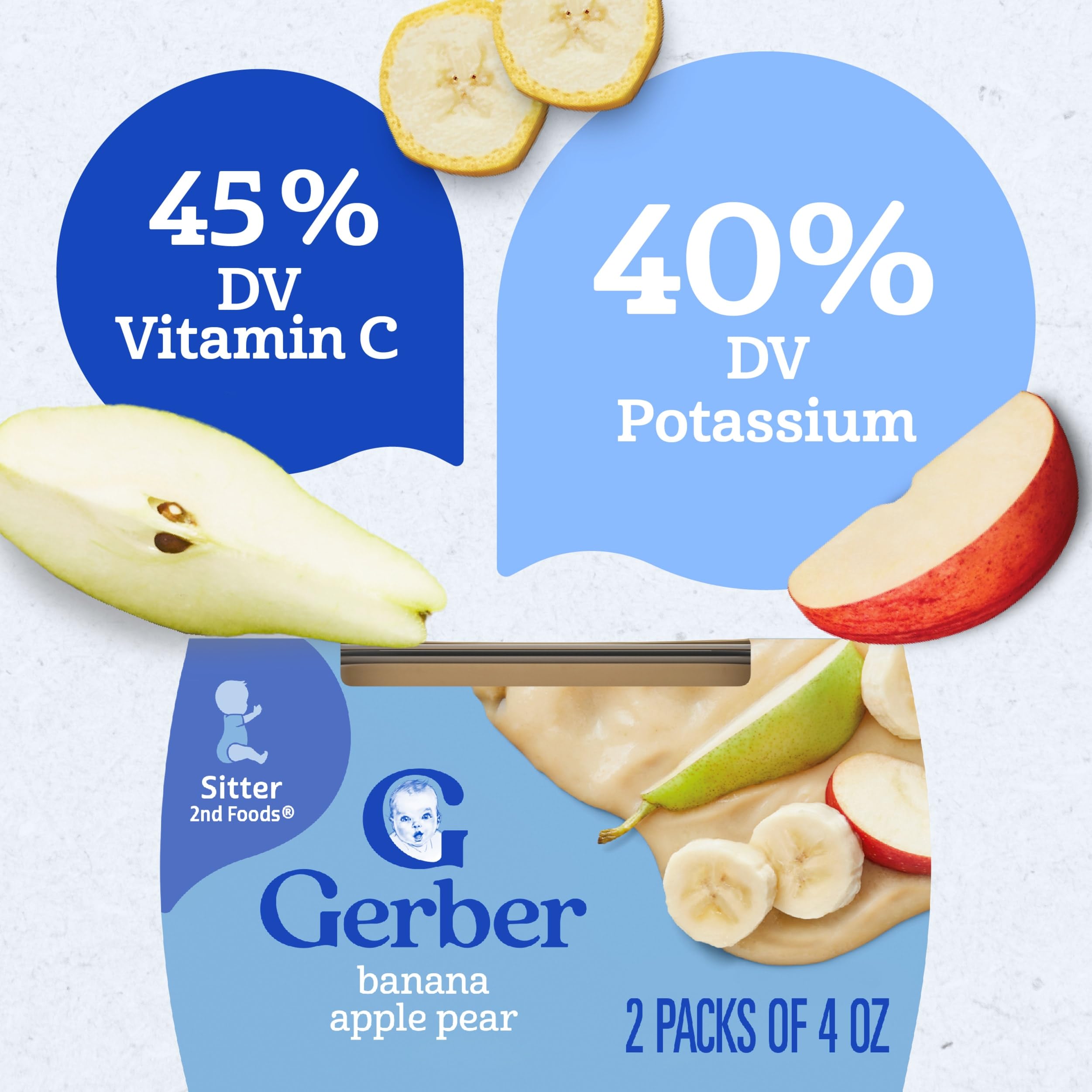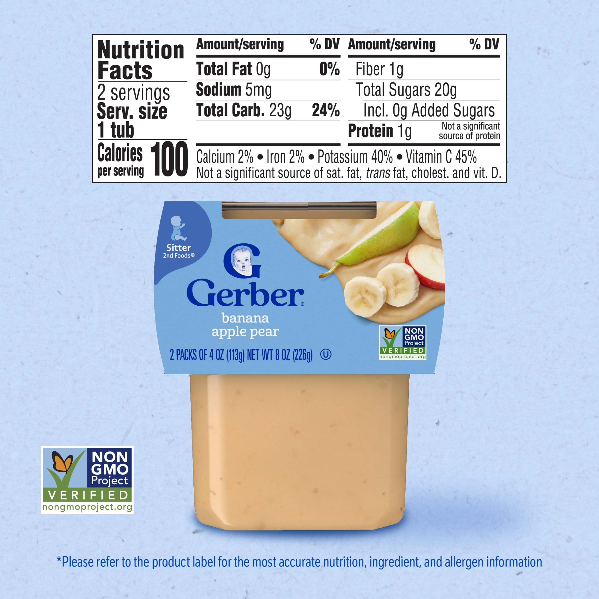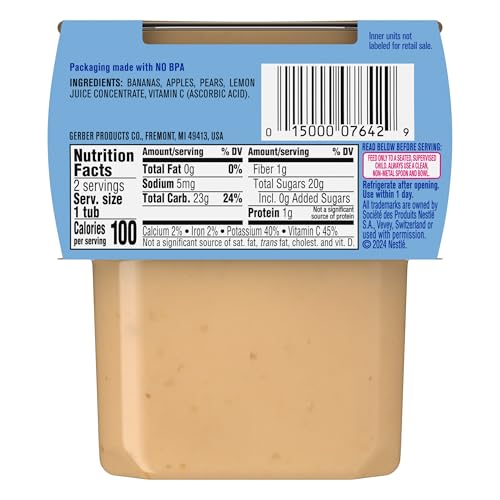 Gerber Stage 2 Baby Food, Banana Apple Pear Puree Tubs are a premium choice for your child’s early stages. Crafted to help support their nutritional needs, along with meeting the busy lifestyle needs of caretakers and parents. Each baby puree tub comes in a portable, easy-to-store format – making it perfect for life’s busy moments. This stage 2 baby food puree is designed for babies who are 6 months + and are ready to explore new textures and flavors. Gerber understands the importance of providing wholesome ingredients during the crucial developmental stages of your child's life -- that’s why our baby puree is Non-GMO Project Verified. Gerber baby puree is ideal for parents who seek a convenient and high-quality option in their baby's diet. These tubs need to be refrigerated after opening and must be used after 1 day.