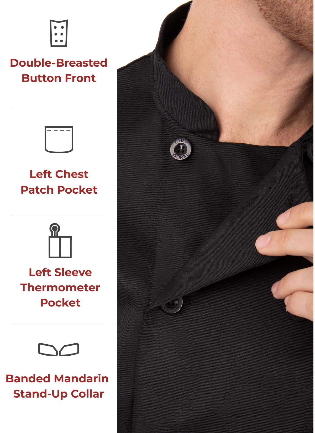 Added Features - Double-breasted button front, left-chest patch pocket, left-sleeve thermometer pocket, and a stand-up collar.