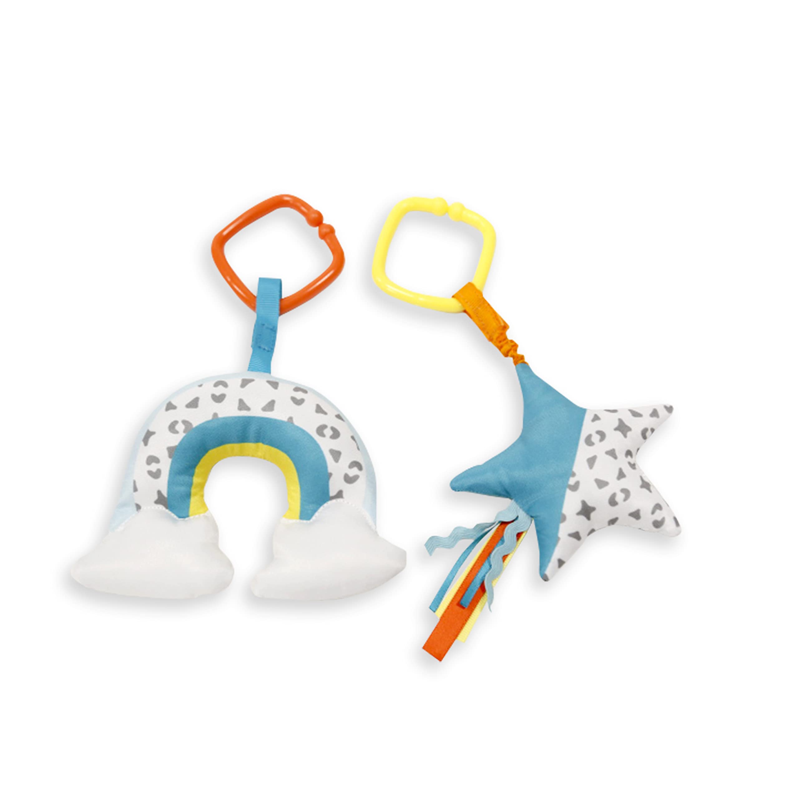 TOYS: This baby activity seat includes removable toys that can be linked to the seat or detached for continued playtime fun. This set includes a two plush toys that delight baby’s senses and keeps them entertained while in their seat (and beyond!).