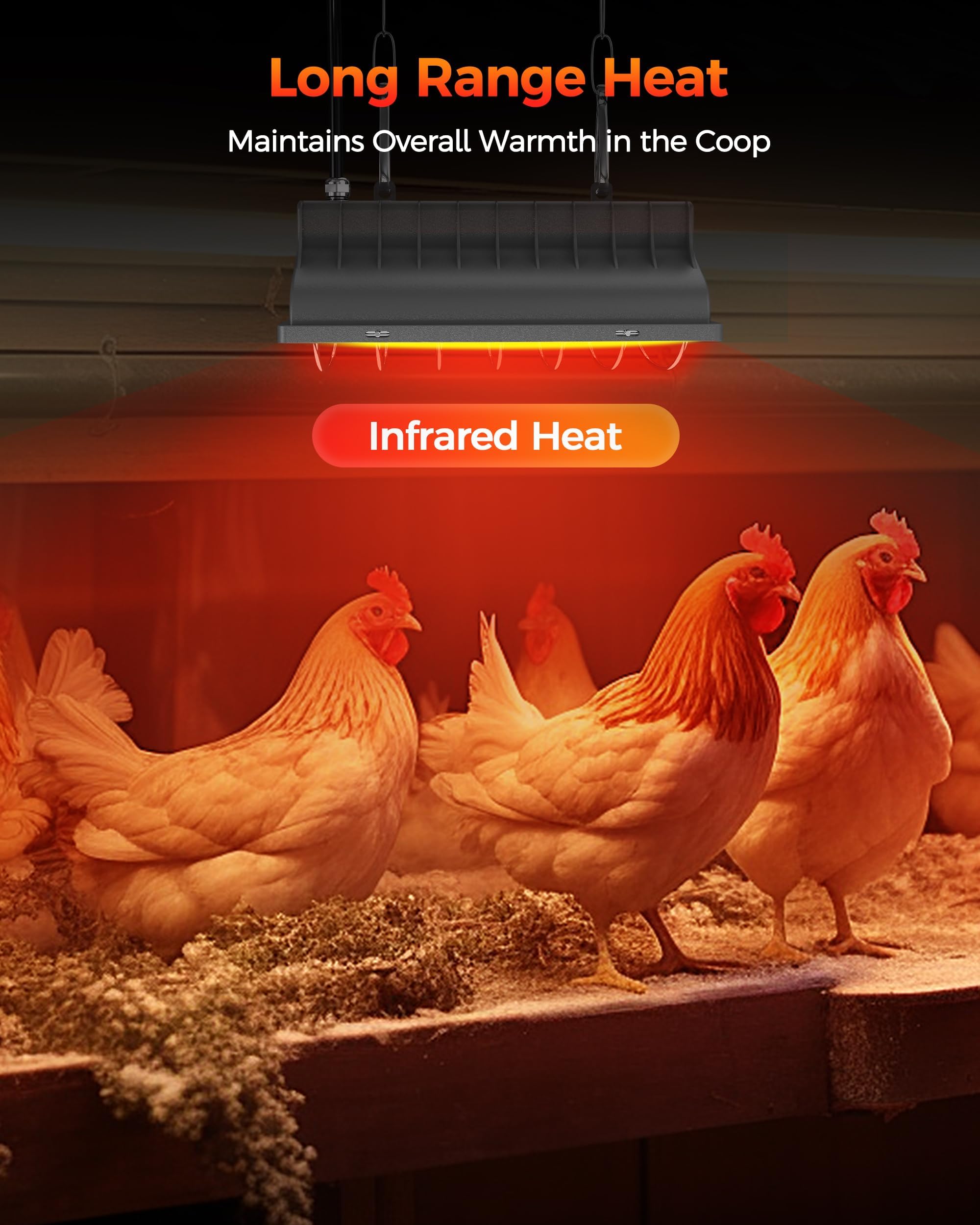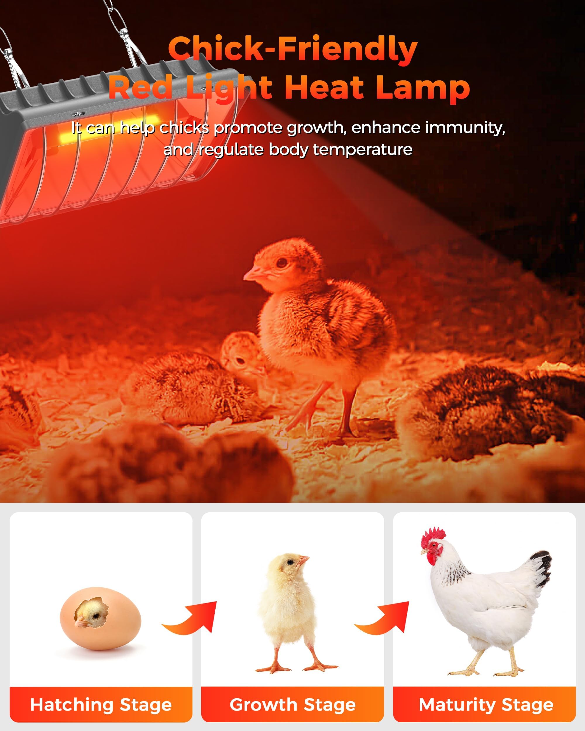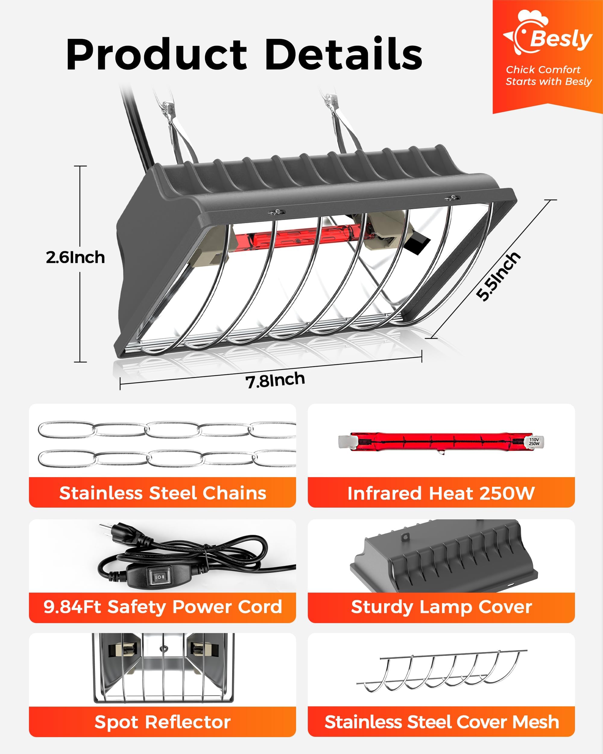 High Performance: The Besly chicken heater for coop uses a 250W infrared heat bulb, providing a powerful heat radiation source. It heats up within 10 seconds and maintains a constant temperature while supplying warmth to chicks, ensuring your chicks stay cozy and comfortable during the cold season