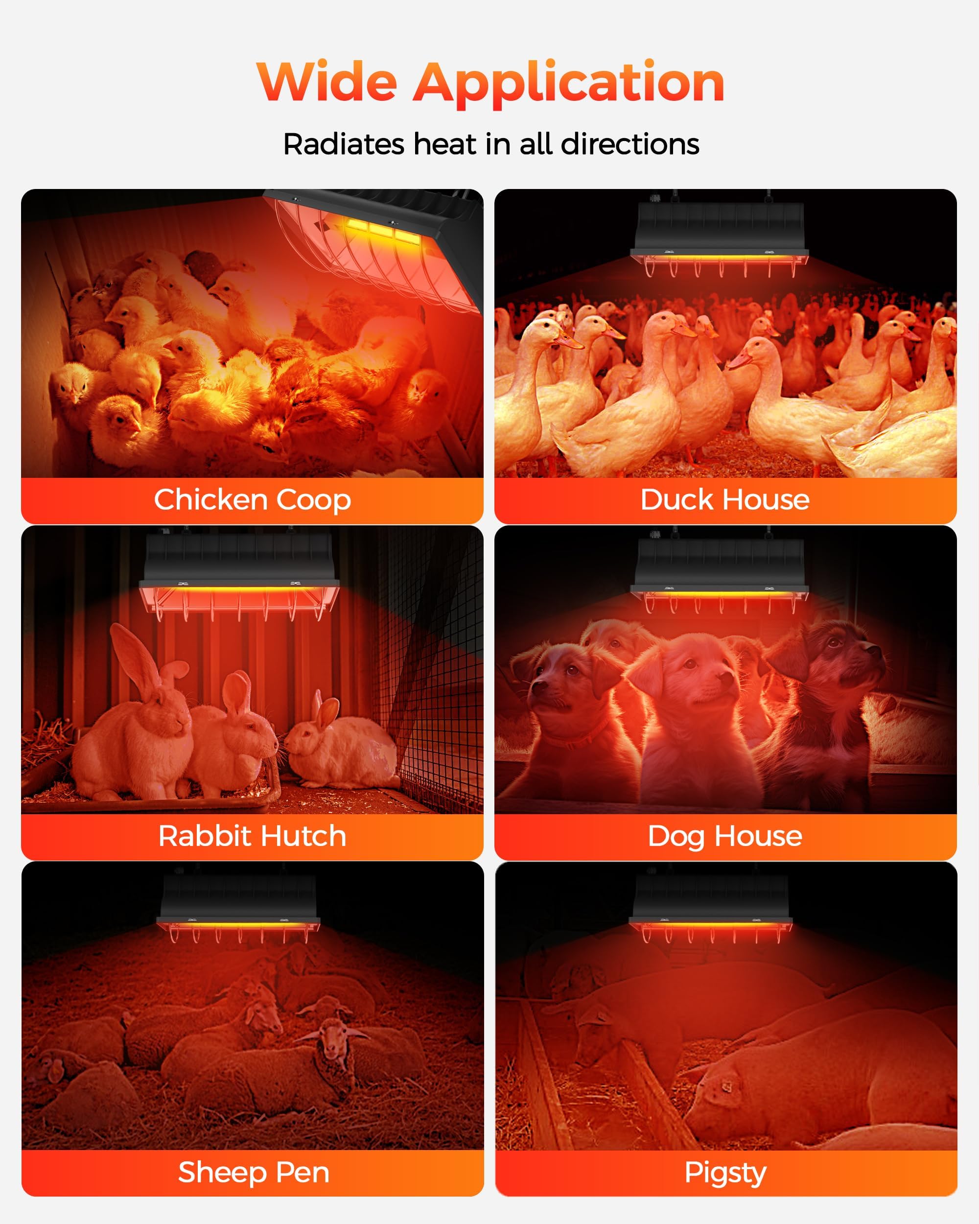 Widely Used: With a wider heat distribution than traditional chicken coop heater panel, it’s suitable for pets and livestock like cats, dogs, chicks, ducks, pigs, and lambs, as well as reptiles, amphibians, and any sick or cold animals. Ideal for poultry brooders, whelping pens, and terrariums