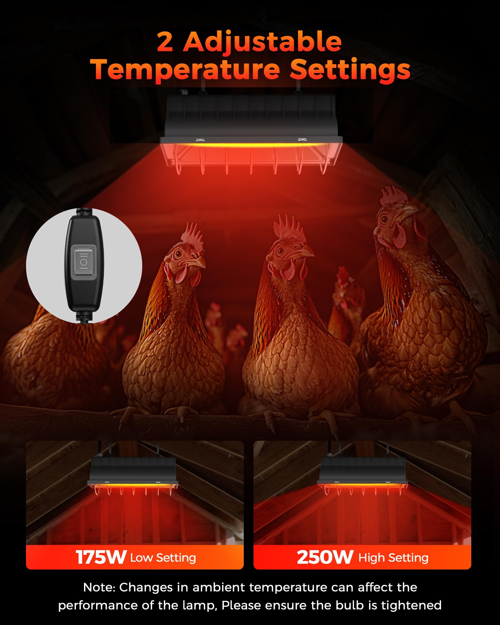 Easy to Install and Use: The installation steps are very simple—just use the included hooks to hang the heater, plug it in, and flip the switch to start using it! It features two settings: high power output of 250W and low power output of 175W, providing a comfortable and safe environment for your chicks