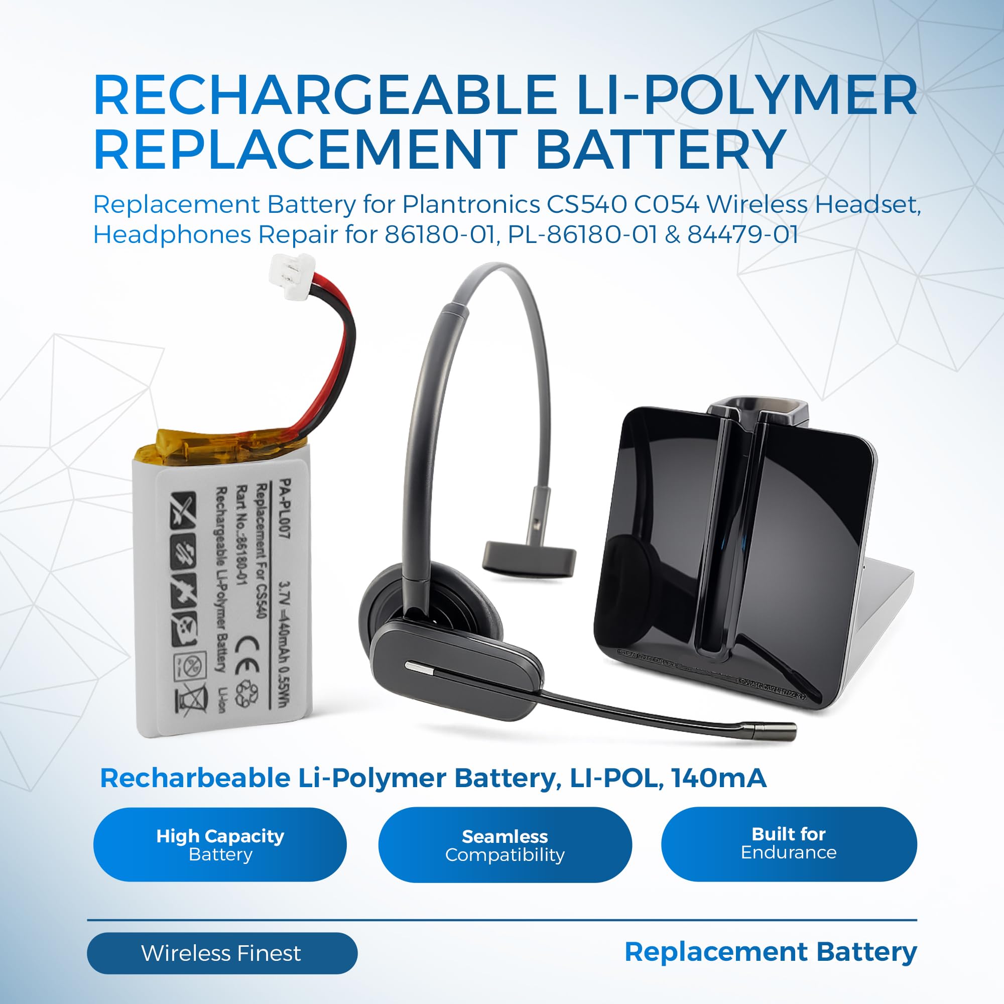 Compatible for Plantronics wireless headset CS540 and C054, batteries part number 86180-01, PL-86180-01 & 84479-01.