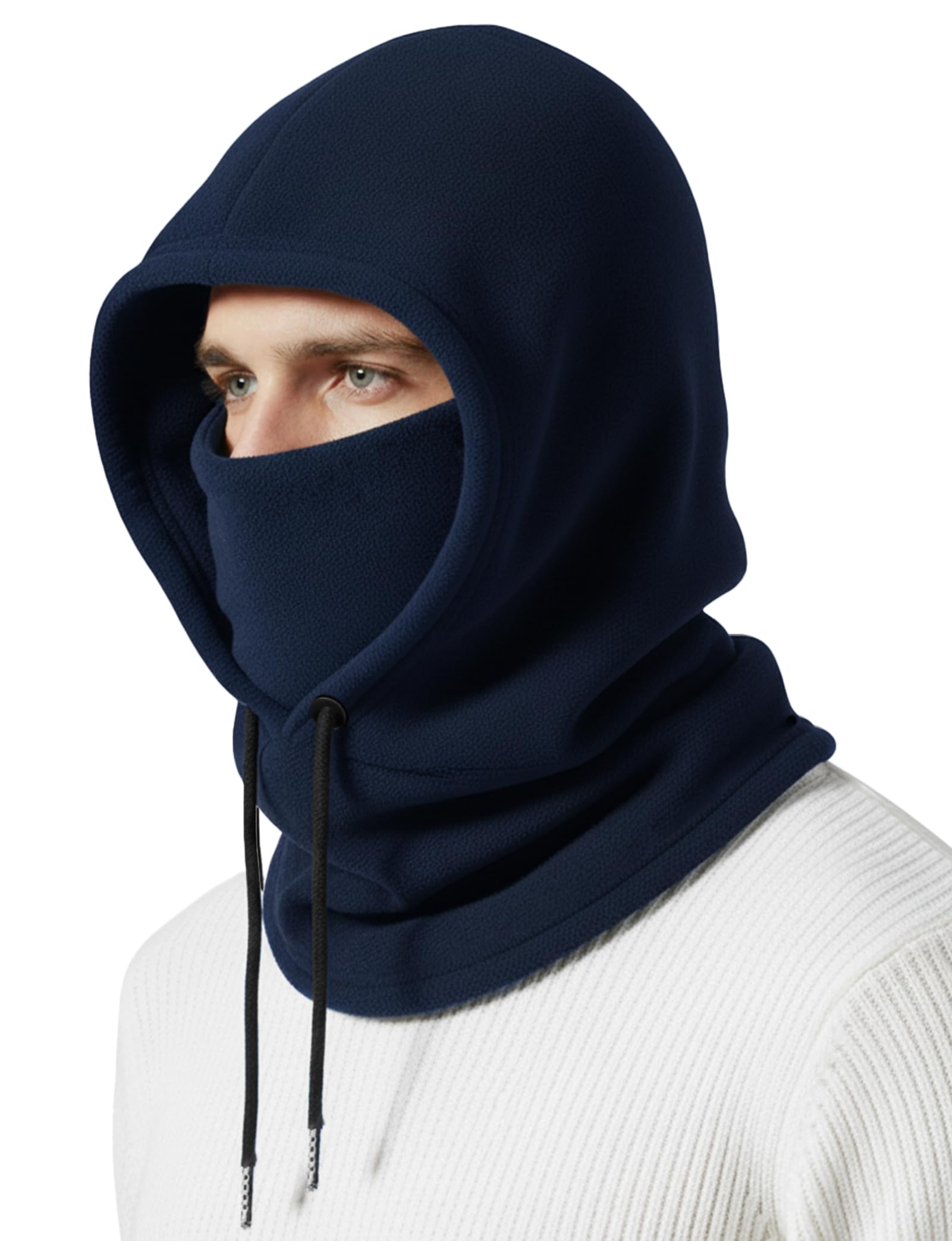 This balaclava is equipped with 2 black knit strings to easily adjust a half face or full face cover. You can choose how you want to cover your face for skiing or other activities. Makes a great motorcycle balaclava as well for cold weather and windproof.