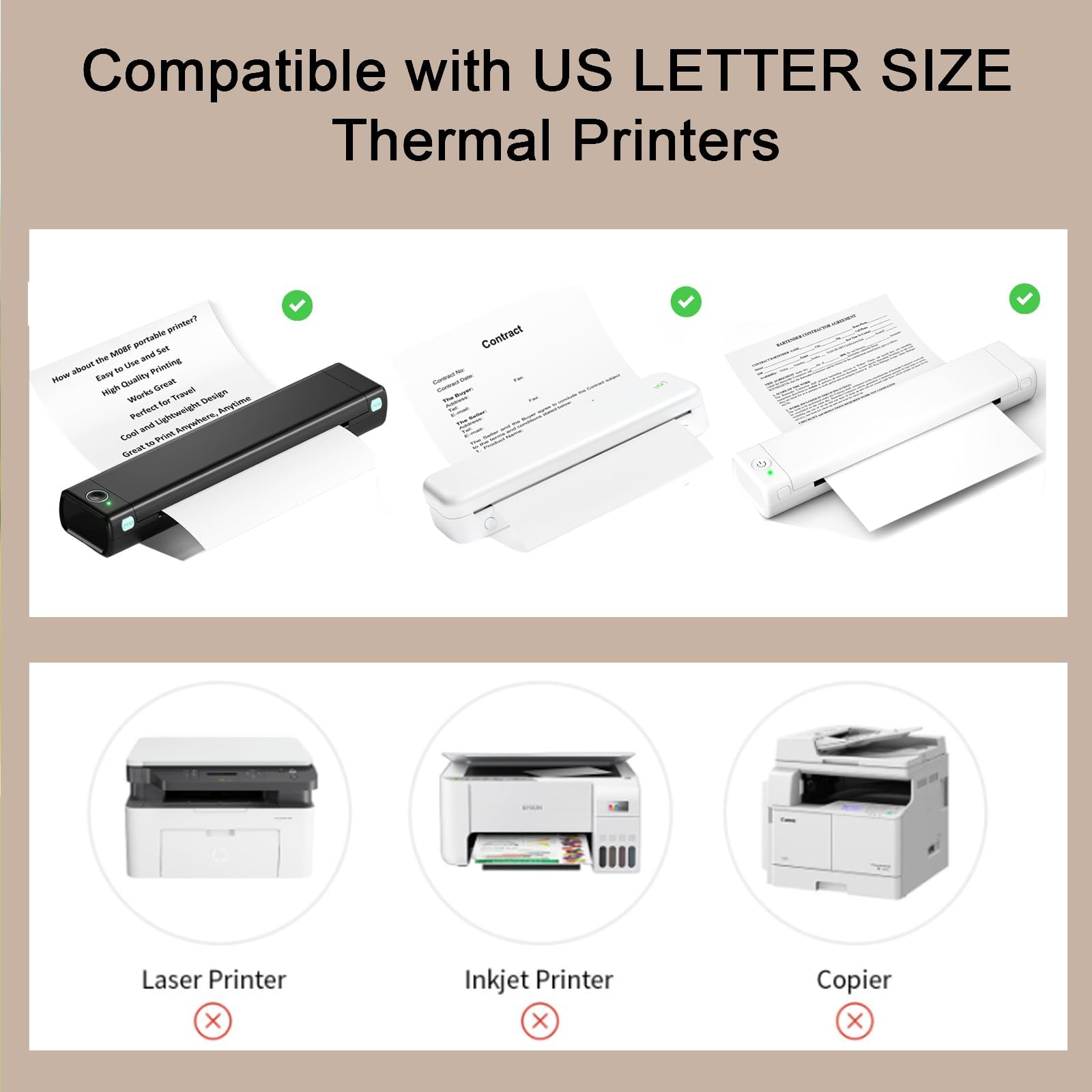 Portable Printer Compatibility: Thermal paper 8.5 x 11 only suitable for letter thermal printer not for traditional inkjet or laser printer. It is easy to use the thermal paper with the corresponding paper size (8.5"×11") printer without any compatibility issues.