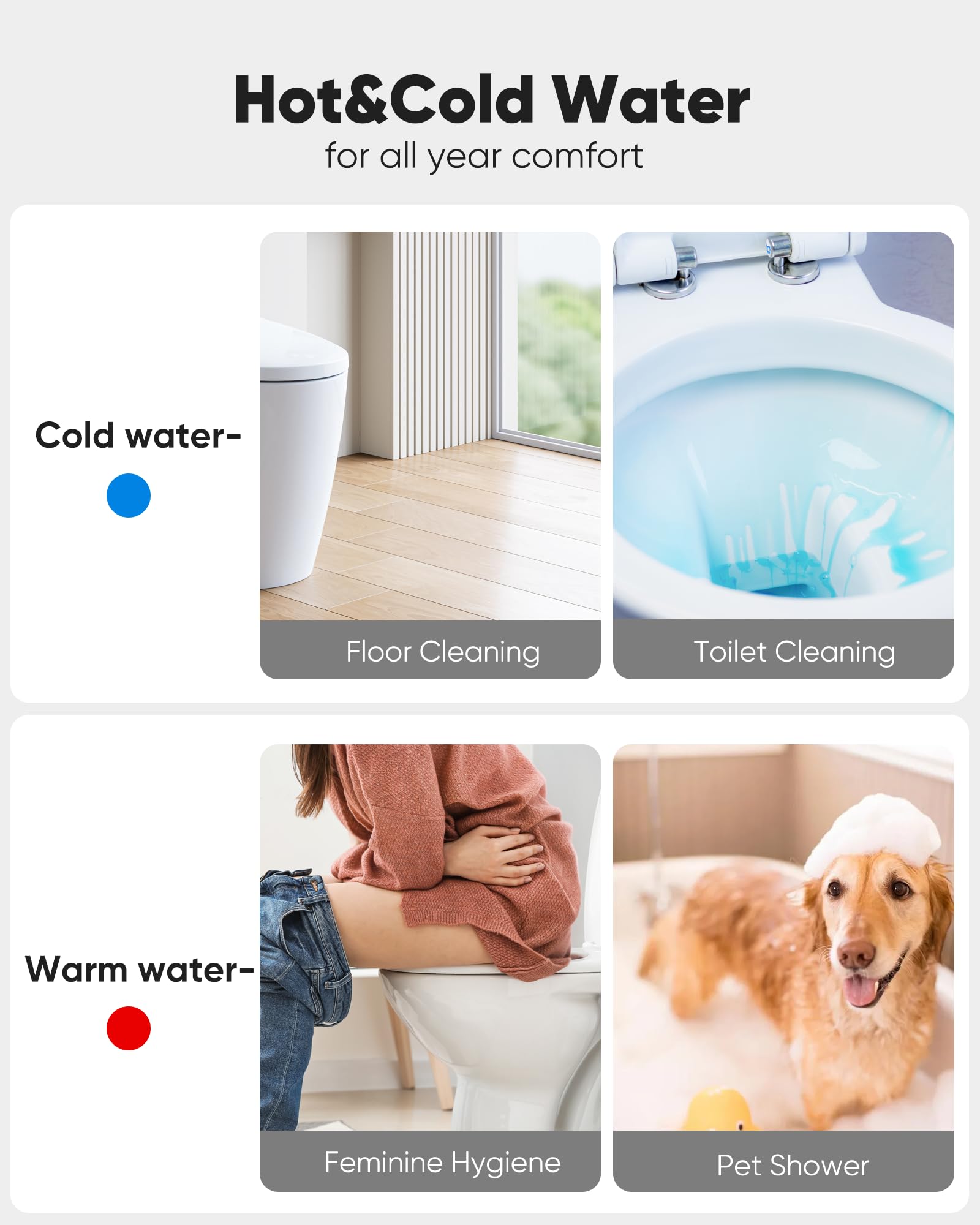 Multiple Uses for Every Need: The bidet sprayer for toilet is prefect for personal hygiene and versatile enough for pet cleaning, plant watering, baby cloth diaper rinsing, feminine hygiene, and toilet floor cleaning etc. It's especially suitable for individuals with limited mobility due to surgery, postpartum recovery, or injuries, making it ideal for elderly adults