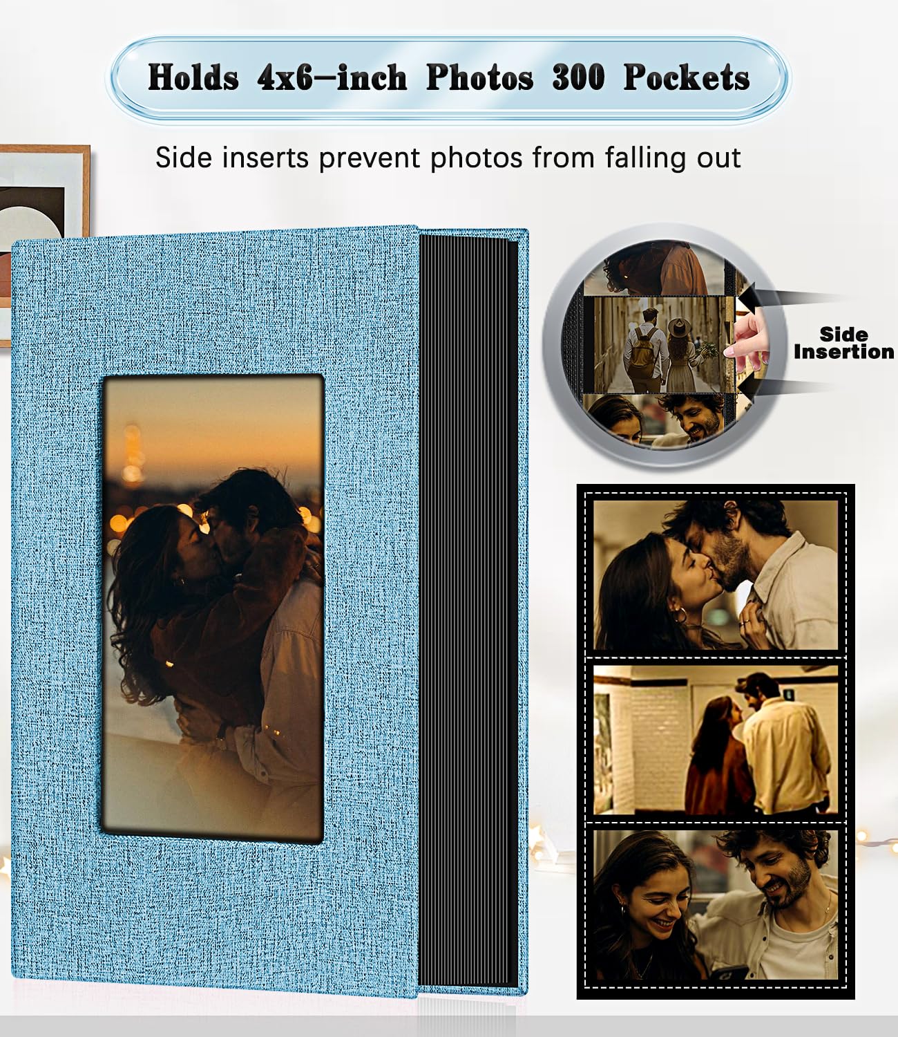 💖 Perfect Storage Capacity: This hardcover photo book is 13 L x 7 W x 2.2 Thick (inches) with 50 sheets/100 pages. 3 horizontal vertical pockets hold a total of 300 4x6 photos.Photos fit snugly in the pockets and won't slip out. Perfect for storing your family, wedding, anniversary, baby and holiday photos, so you can organise and display your photos beautifully and conveniently.