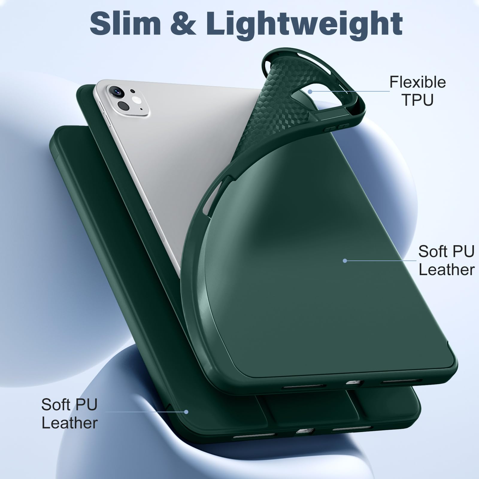 【Full Protection】The outer layer of the iPad Pro 11 inch m5 case is crafted from PU leather, offering a soft and comfortable feel. The inner shell frame utilizes shock-absorbing TPU material, providing exceptional drop and impact protection.