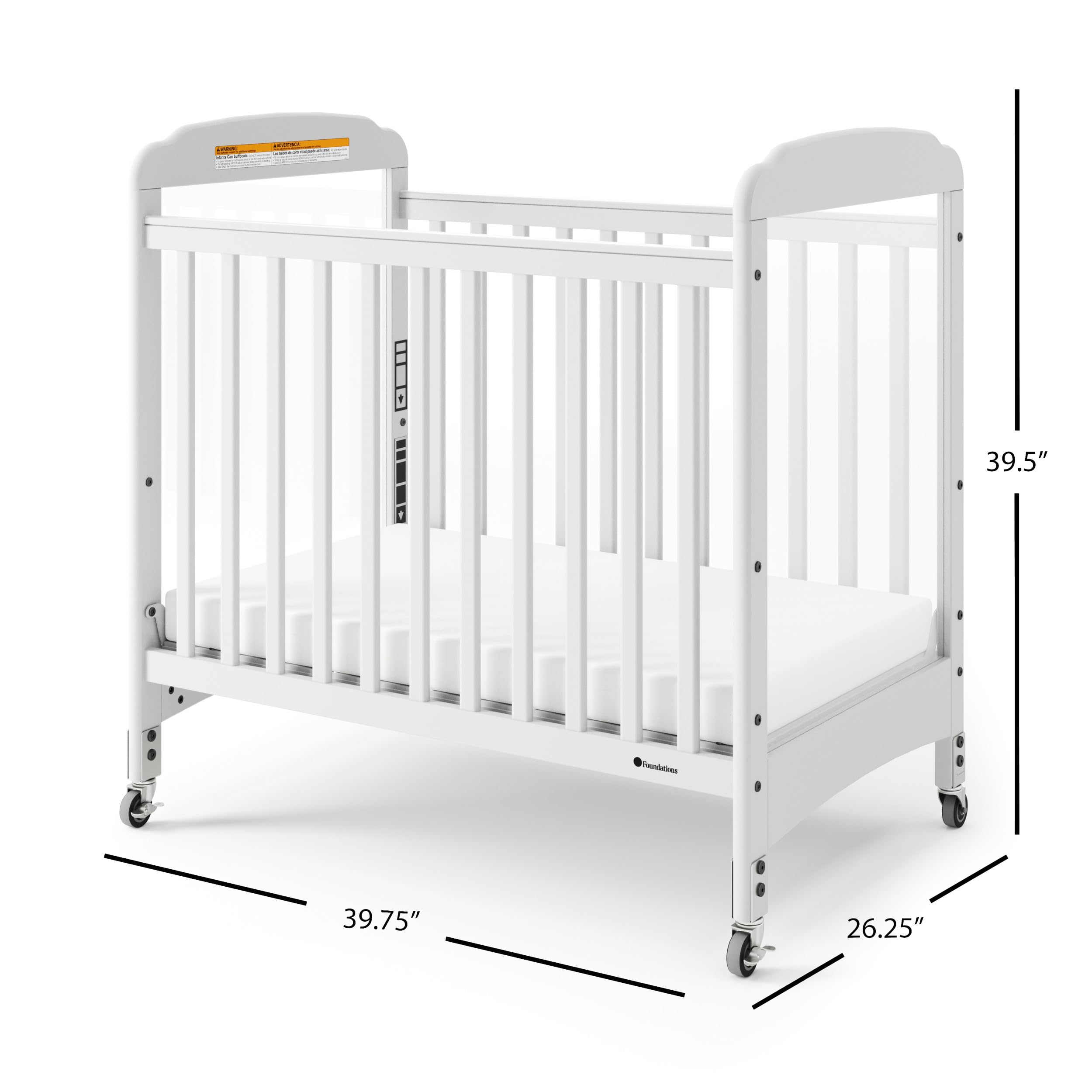Compact Wood Crib: Durable, fixed-side compact crib design is perfect for childcare centers. Assembled dimensions: 39.75” L x 26.25” W x 42.1” H, with a weight of 50 pounds.