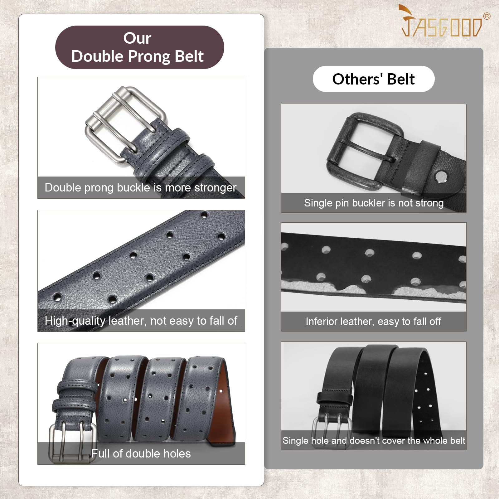Special Double Prong Design: Do you want to have one belt different from your daily wear? Our double prong buckle and double holes belt can be your ideal one. It can show your distinctive personality and our unique design of this casual belt won’t let you go unnoticed in crowds.