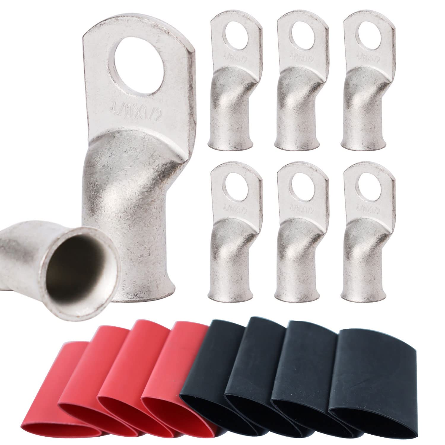 【What You Get:】 8Pcs per pack of 4/0 Guage (AWG) 1/2" marine grade tinned copper lugs ring terminals closed end termination ring terminals with 8 Pcs 3:1 Dual Wall Adhesive Heat Shrink Tubing Tube for your work(4pcs Black and 4pcs Red).