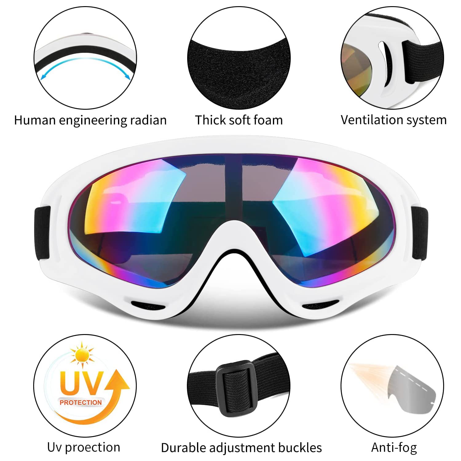 Performance Snow Goggles: With circular holes are distributed around them to provide maximum airflow in the goggles, which can prevent fog to a certain extent. Tinted lenses offer UV400 protection against UV rays, while clear lenses ensure optimal visibility on cloudy days.