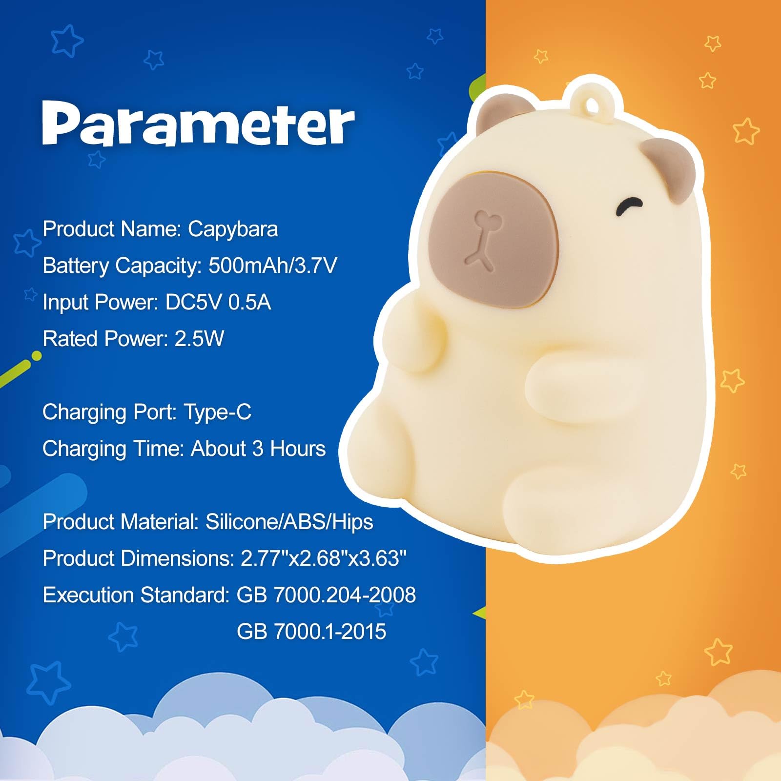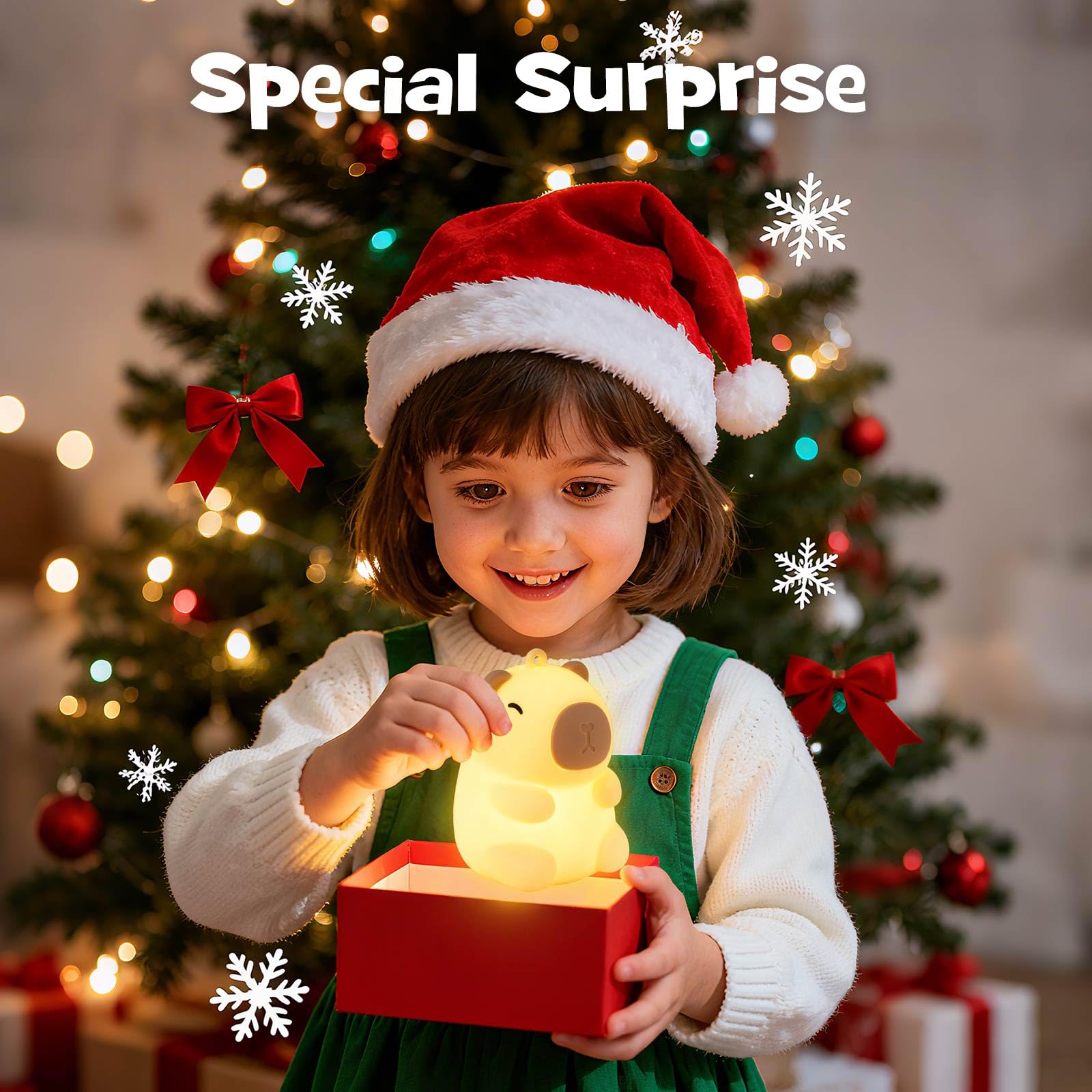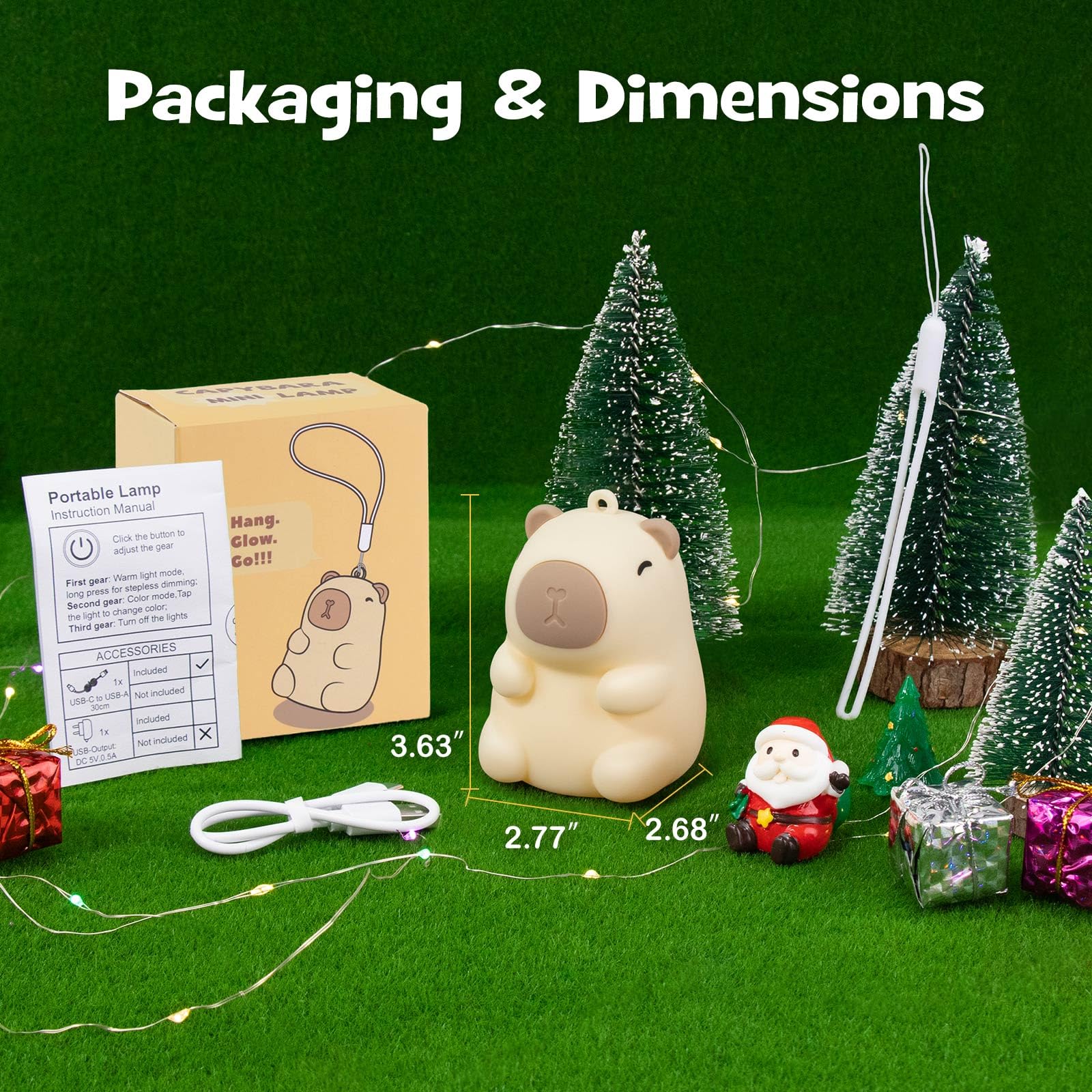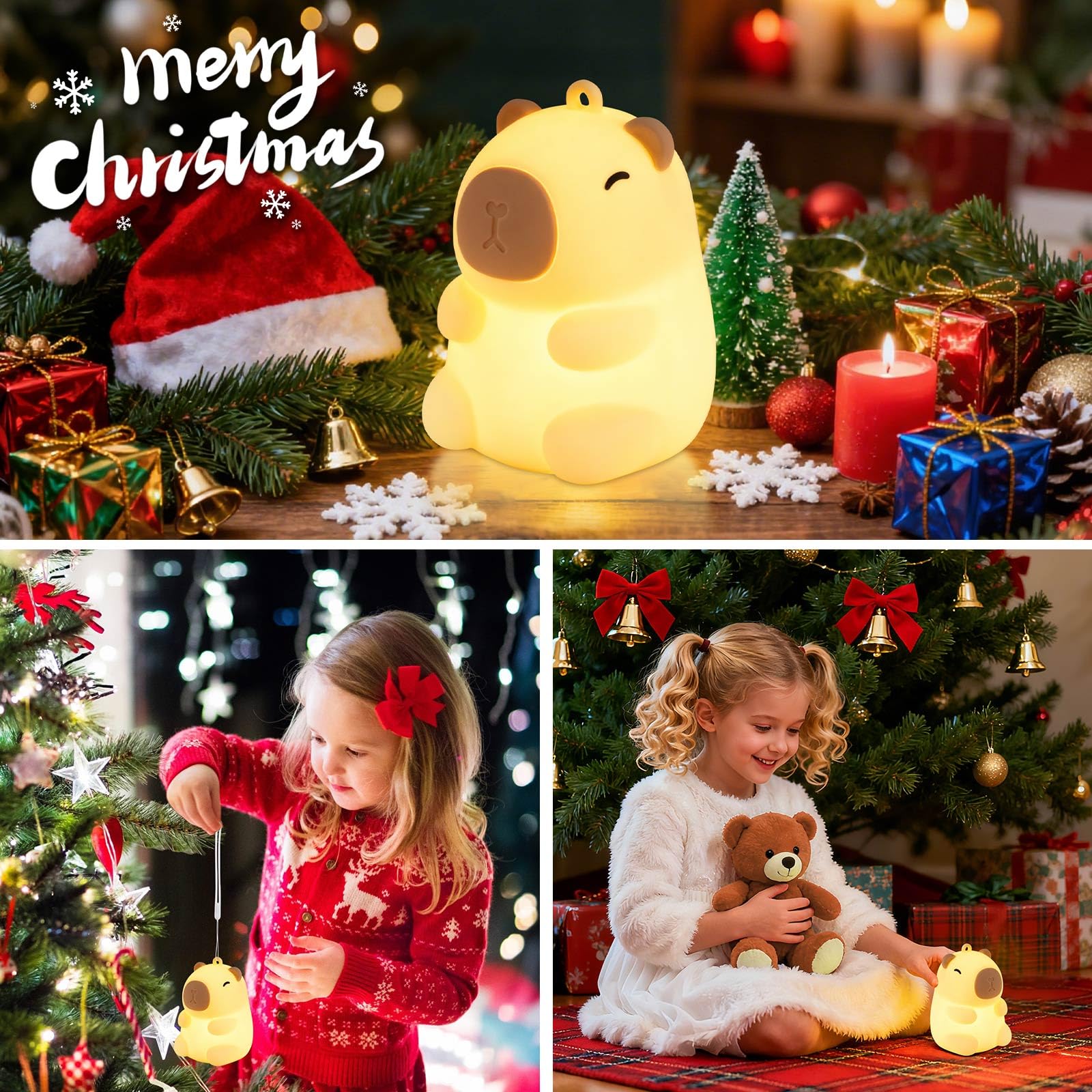 Combining colorful RGB light mode and warm light mode, Gefaxi squishy Christmas capybara night light is eye-catching on a shelf and calming by the bed, is great for anyone looking to add warmth and fun to their space. Whether you need a soft nightlight glow to wind down after a long day or a pop of color to liven up a party, this little fun capybara animal lamp does it all. 1. The discreet hanging loop lets you suspend it from a real Christmas tree branch or wall hook for extra whimsy. 2. The comfortable silicone shell is fun to touch and squeeze without damage, helps you relieve stress. 3. The built-in 500mAh rechargeable battery provides 120 hours of glowing ambiance on a full charge. No matter who you're shopping for, this playful capybara lamp turns everyday lighting into an instant festive celebration. Product Name: Gefaxi Christmas Capybara Night Light Battery Capacity: 500mAh/3.7V Input Power: DC5V 0.5A Charging Port: Type-C Rated Power: 2.5W Charging Time: About 3 Hours Product Material: Silicone/ABS/Hips Product Dimensions: 2.77"x2.77"x3.90" Applicable Places: Bedroom, Nursery, Living Room, Study Room, Entryway, Hallway