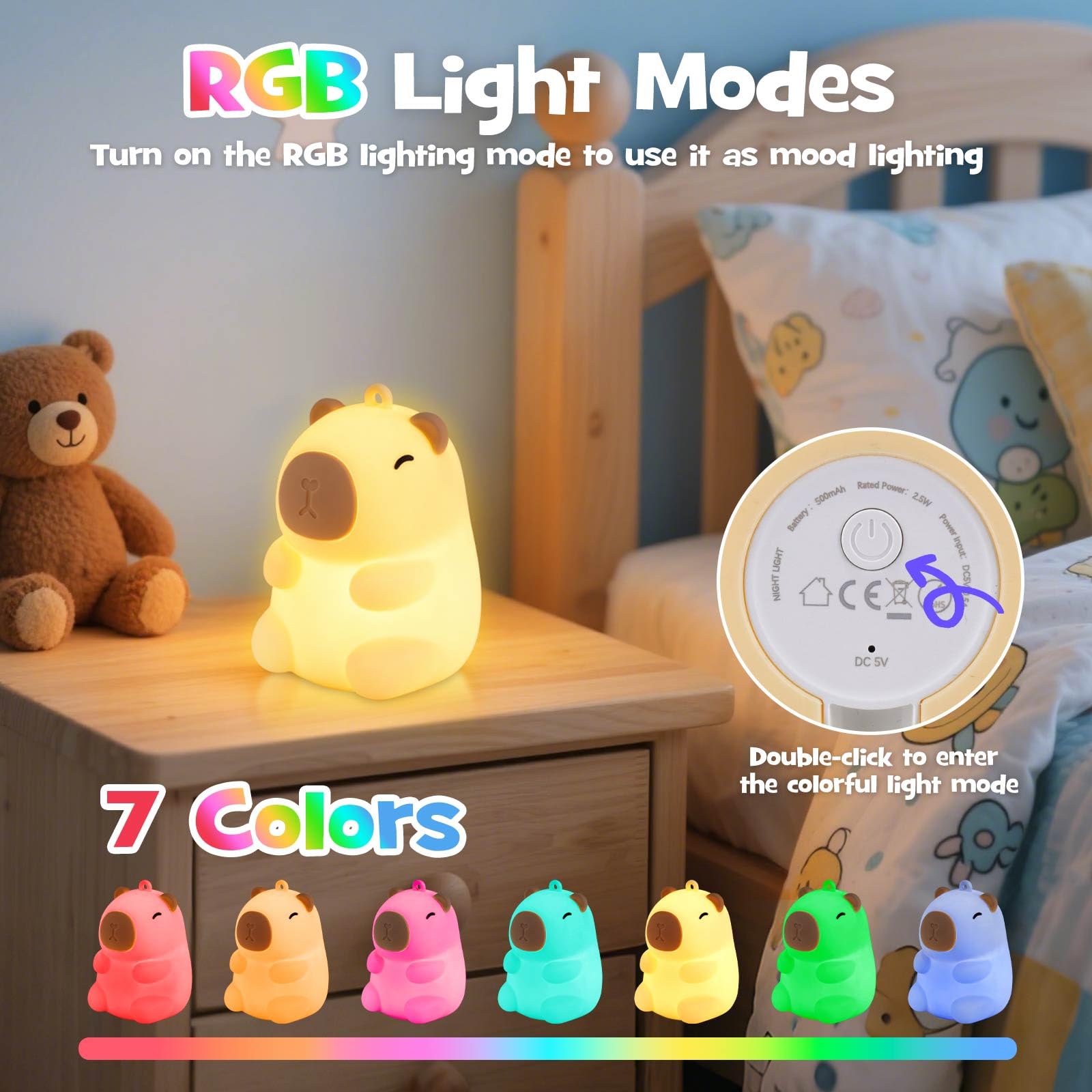 Multi-Color Modes for Every Mood - Press the sensitive touch control to switch through vibrant RGB color lighting mode or warm light mode. This Gefaxi fun Christmas capybara desk lamp offers 7 ambient colors, makes it a delightful accent for parties and holiday gatherings. Also, you could switch to the warm white mode and long press to adjust the brightness for a comforting sleeping vibe.