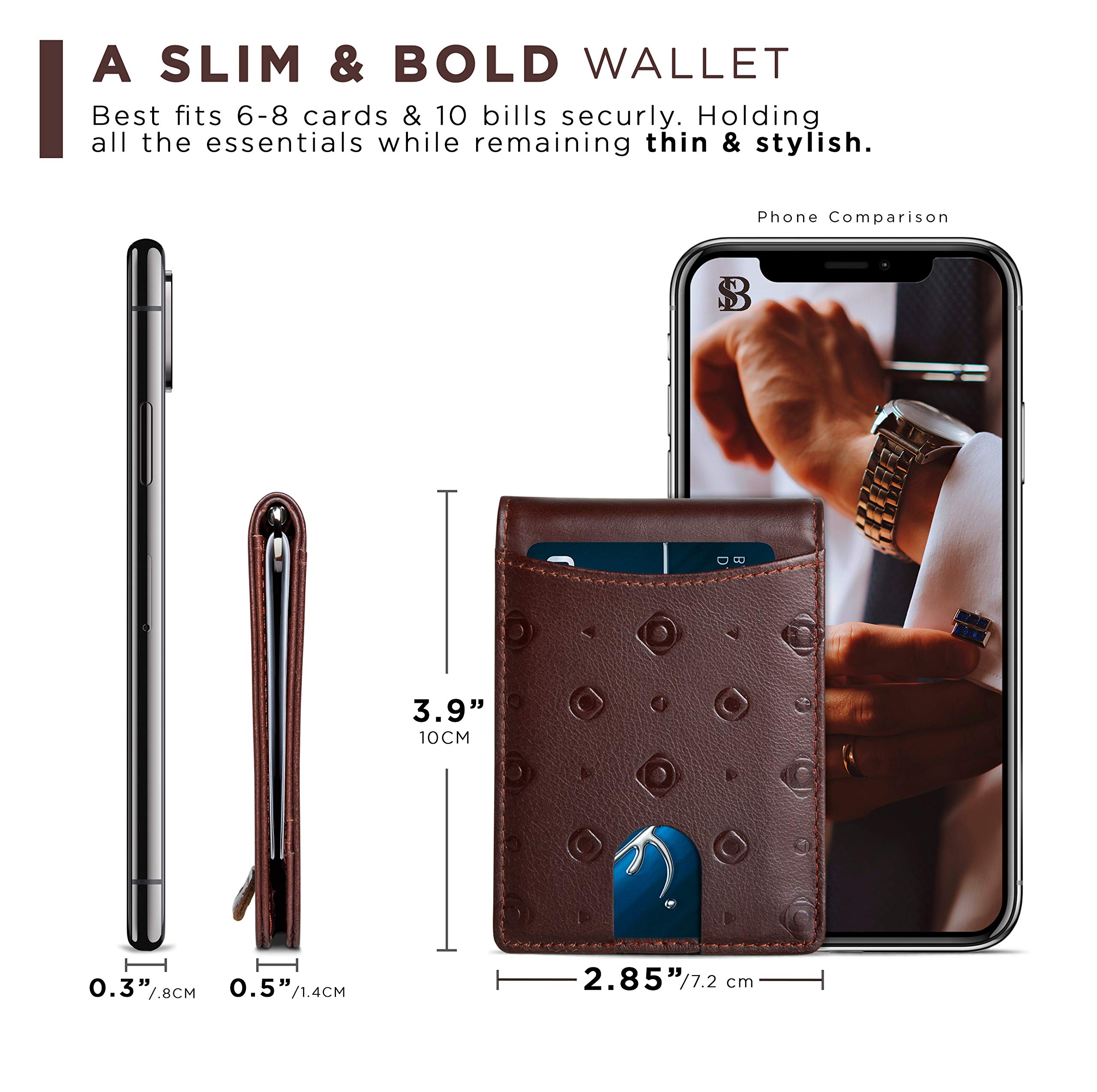 SLIM AND STYLISH - Made with the Finest Full Grain leather, Top Grain Leather and Vegan Leather. Designed Quick Access ID Windows, Best Fits 6-8 cards plus US bills with no bulk, and a minimal Pull-tab design to reduce bulk - Wallet Size: 3.9" in. x 2.85" in. 0.5" in.