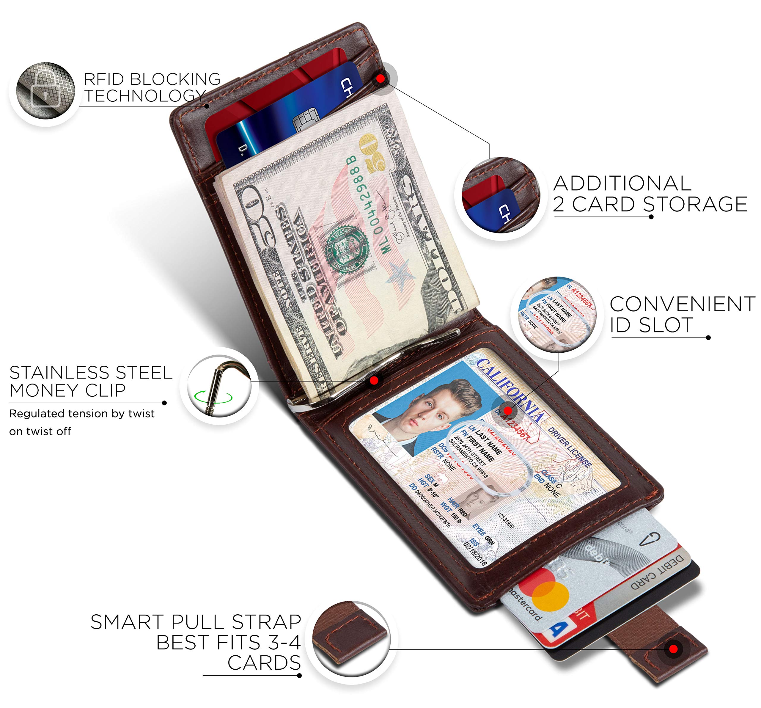 HOW IT WORKS- At last! A wallet that will meet your everyday needs. The SERMAN BRANDS card holder is equipped with a front pocket made for your most used card. 2 pockets on the inside, with a photo ID slot, and a money clip to hold your cash. Wallet case also has smart pull-strap for quick access to your everyday cards.