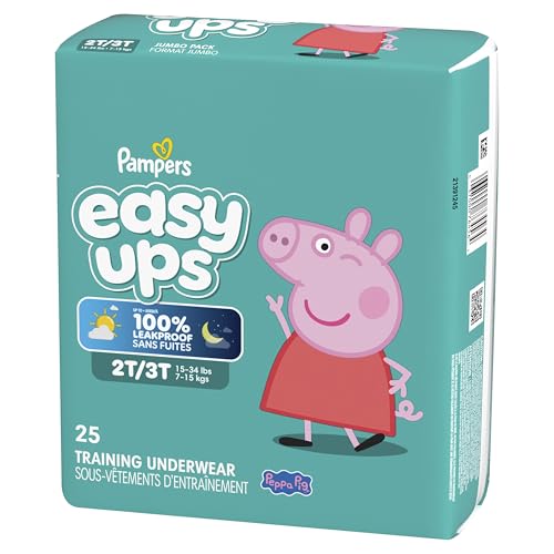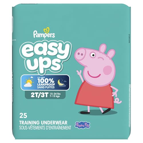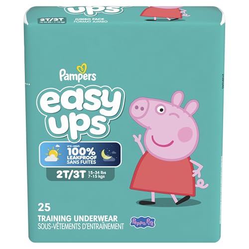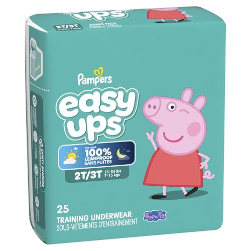 Ready to potty train with Peppa? Pampers Easy Ups Training Pants featuring Peppa Pig makes it easy. They pair the feeling of real underwear with the protection of Pampers to make potty training easier for everyone. Give your child the confidence to take on potty training with a little more independence and a lot more fun. Easy Ups Training Pants feature stretchy sides and an underwear-like waistband for easy pull up and down, plus an ultra-absorbent core with LockAway Channel to help keep them dry day and night. With up to 2X better protection day and night*, Easy Ups training pants deliver up to 100% leakproof protection. These hypoallergenic, dermatologist-approved pull ups are made with 0% elemental chlorine, parabens, or latex** and backed by the Pampers Safety Promise. Fun Peppa designs motivate your toddler to potty train. Pampers Easy Ups training pants are also available with Bluey! Pair with Pampers Sensitive Wipes to help keep your toddler's skin healthy. Find your toddler’s best fit in the following sizes: training pants 2T–3T (diaper size 4,15–34 lbs.), training pants 3T–4T (diaper size 5, 20–40 lbs.), training pants 4T–5T (diaper size 6, 23-50 lbs.), training pants 5T–6T (diaper size 7, 35–60 lbs.), training pants 6T–7T (diaper size 8, 46+ lbs.) *Urine leaks vs. leading competitor size 2T-3T ** No natural rubber †Pricing based on MSRP; excludes Easy Ups Jumbo. Pricing at the sole discretion of the retailer