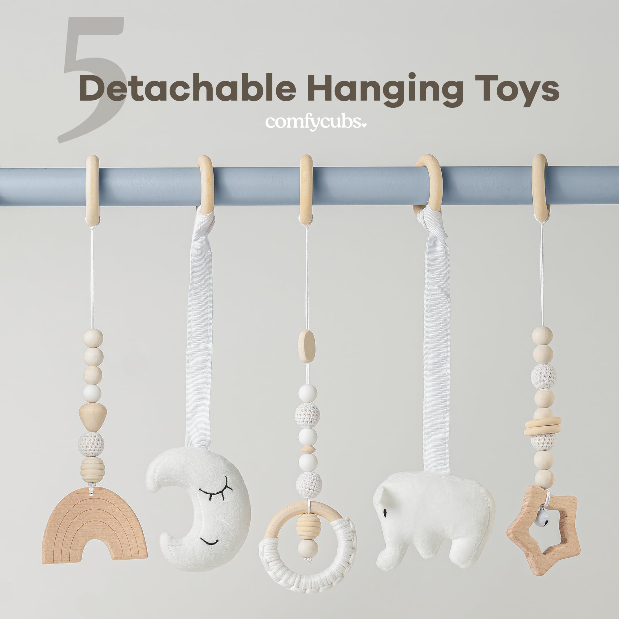 Montessori Play Gym for Toddlers: Comfy Cubs wooden baby gym includes 5 adorable hanging toys in white and wood tones, designed to stimulate your baby’s visual and tactile senses. Helps develop hand-eye coordination and strengthens fine motor skills from an early age.