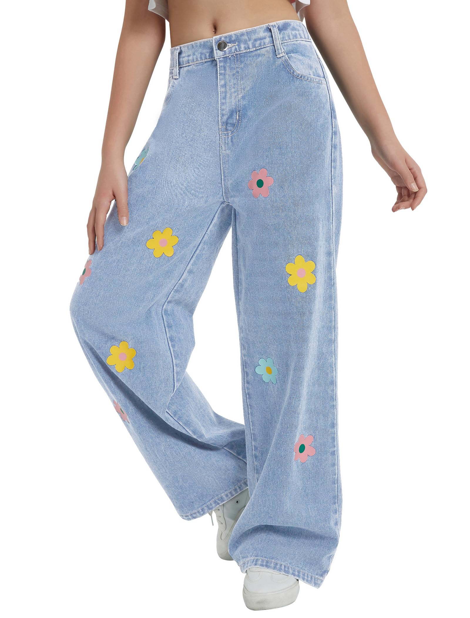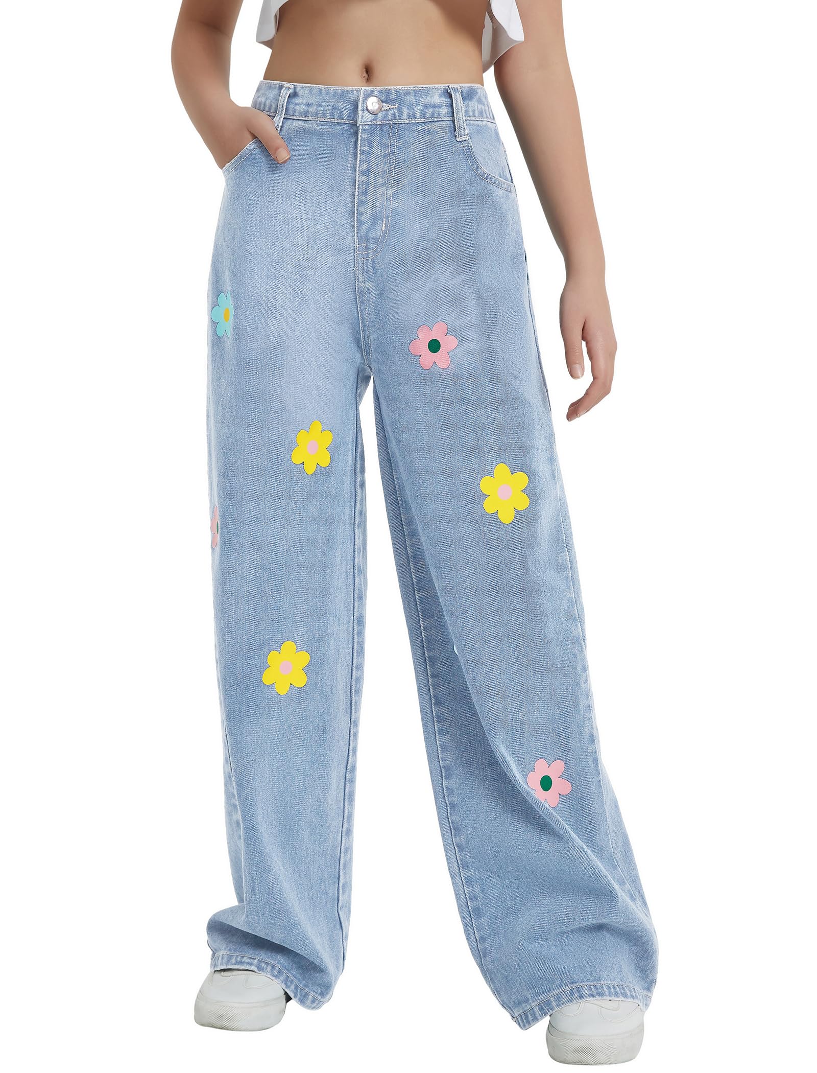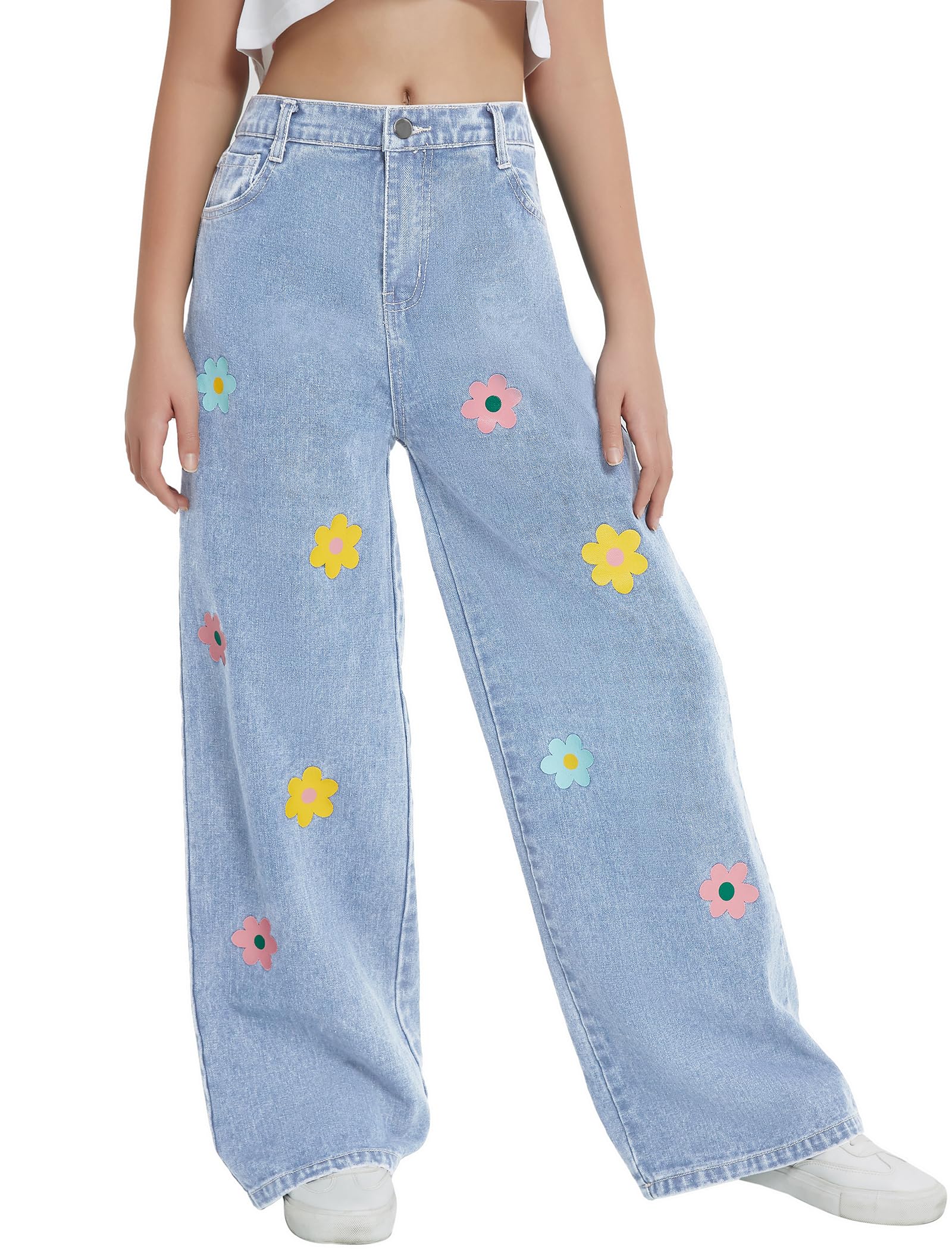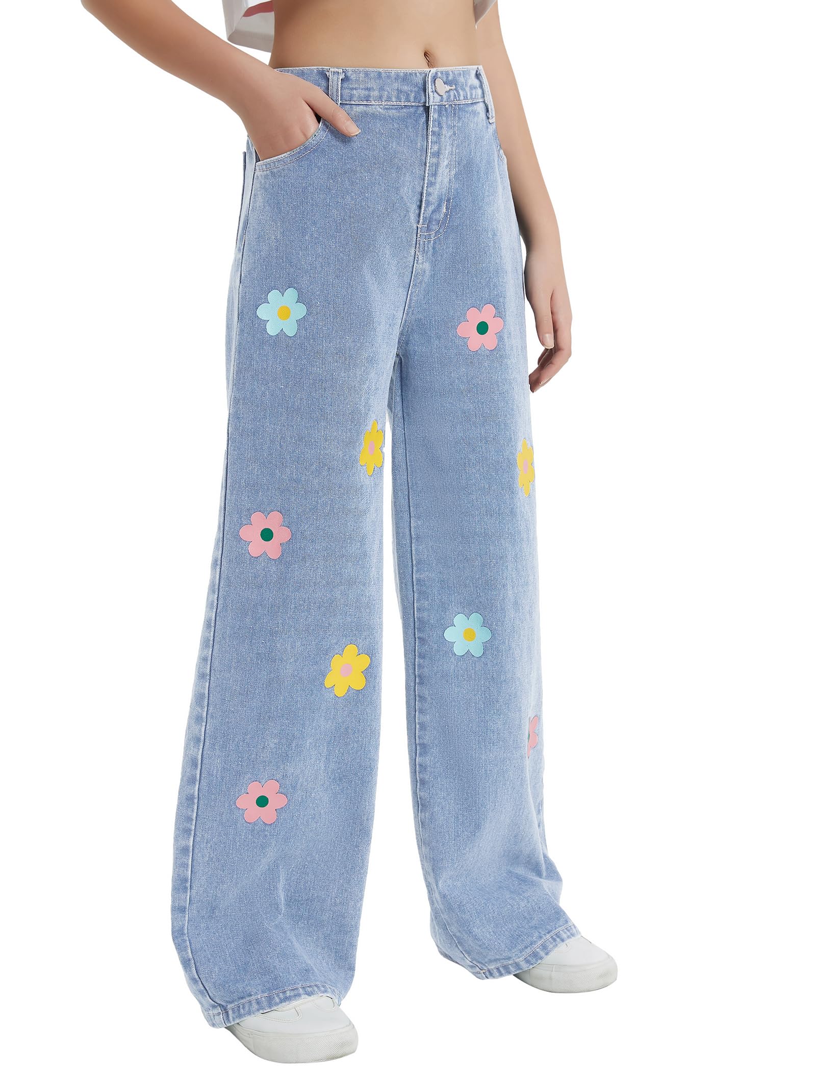 Floral Printed Jeans: Girl's wide leg pants have a fluid silhouette and an elasticized waist. The high waisted relaxed fit allows girls of all shapes and sizes, and the ankle length accentuates the curves of the legs