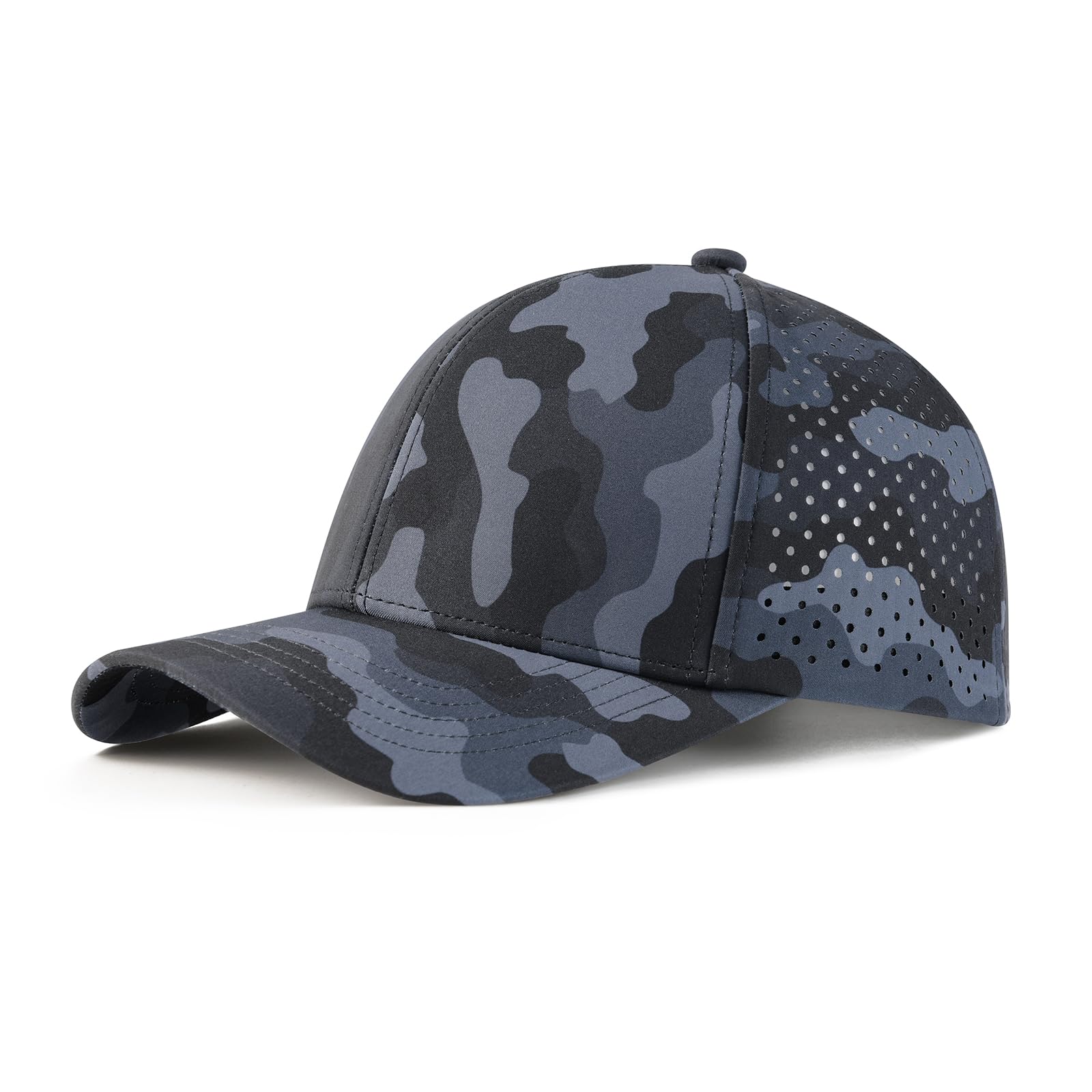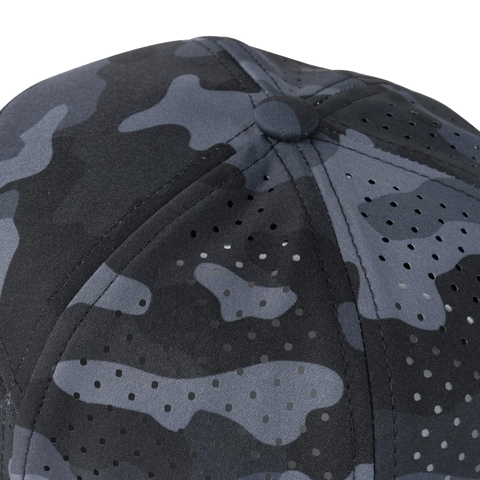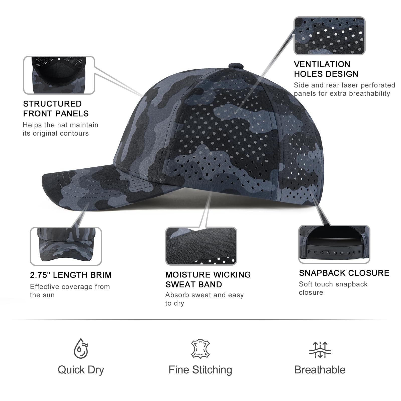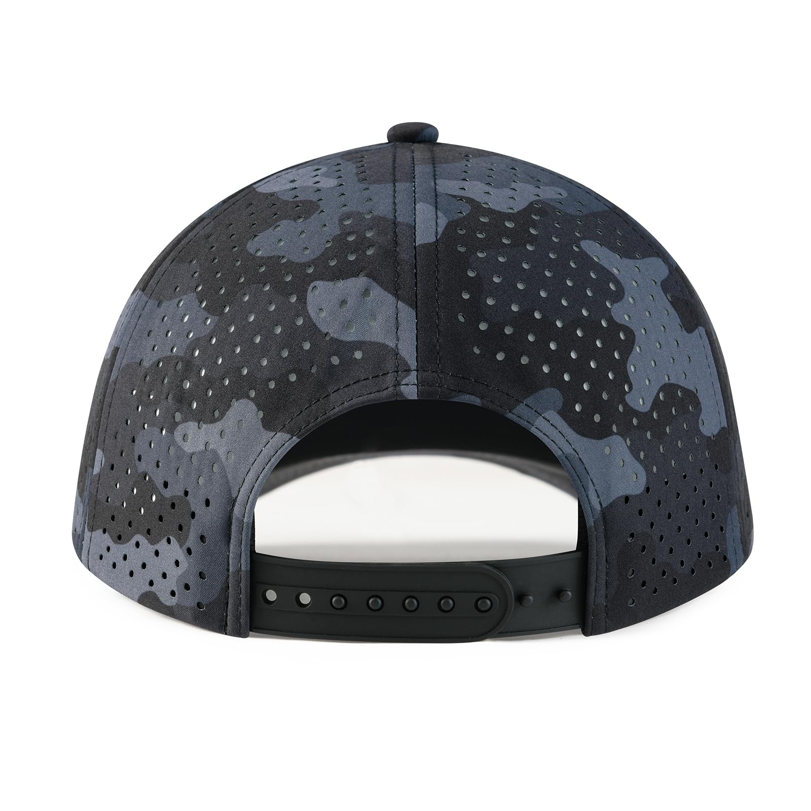 Design: structured front panels, 6-panel cap, curved brim, laser-perforated side & rear panels for breathability, and soft touch snapback closure