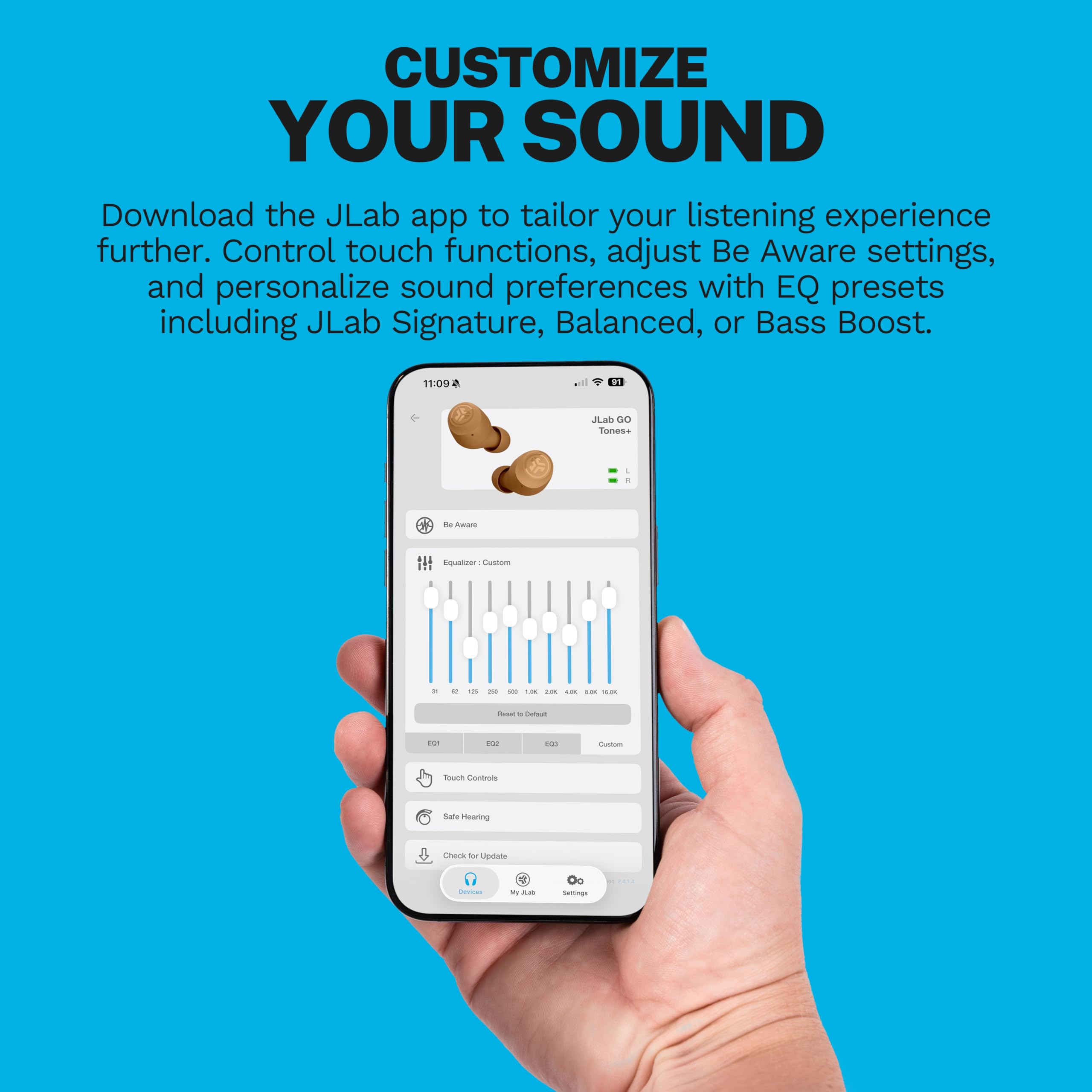 Custom Sound: Download the JLab app to tailor your listening experience further. Control touch functions, adjust Be Aware settings, and personalize sound preferences with EQ presets including JLab Signature, Balanced, or Bass Boost.