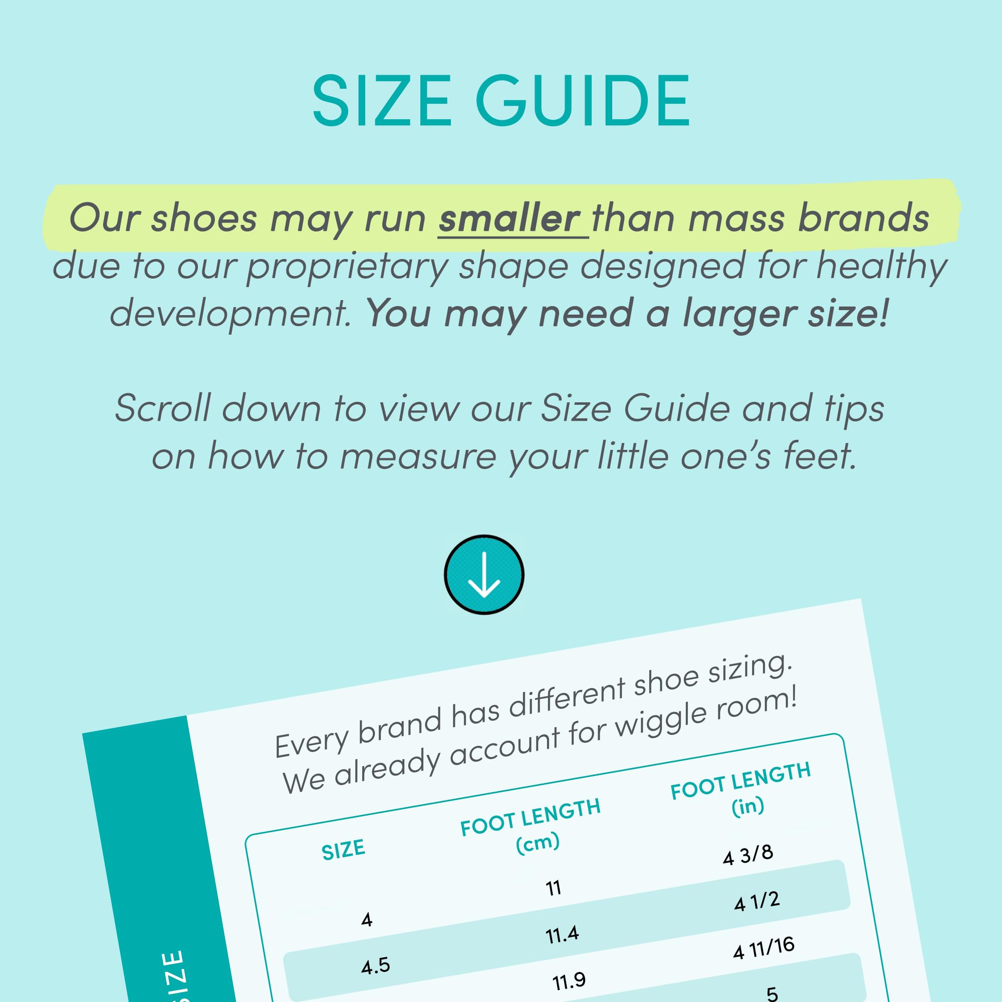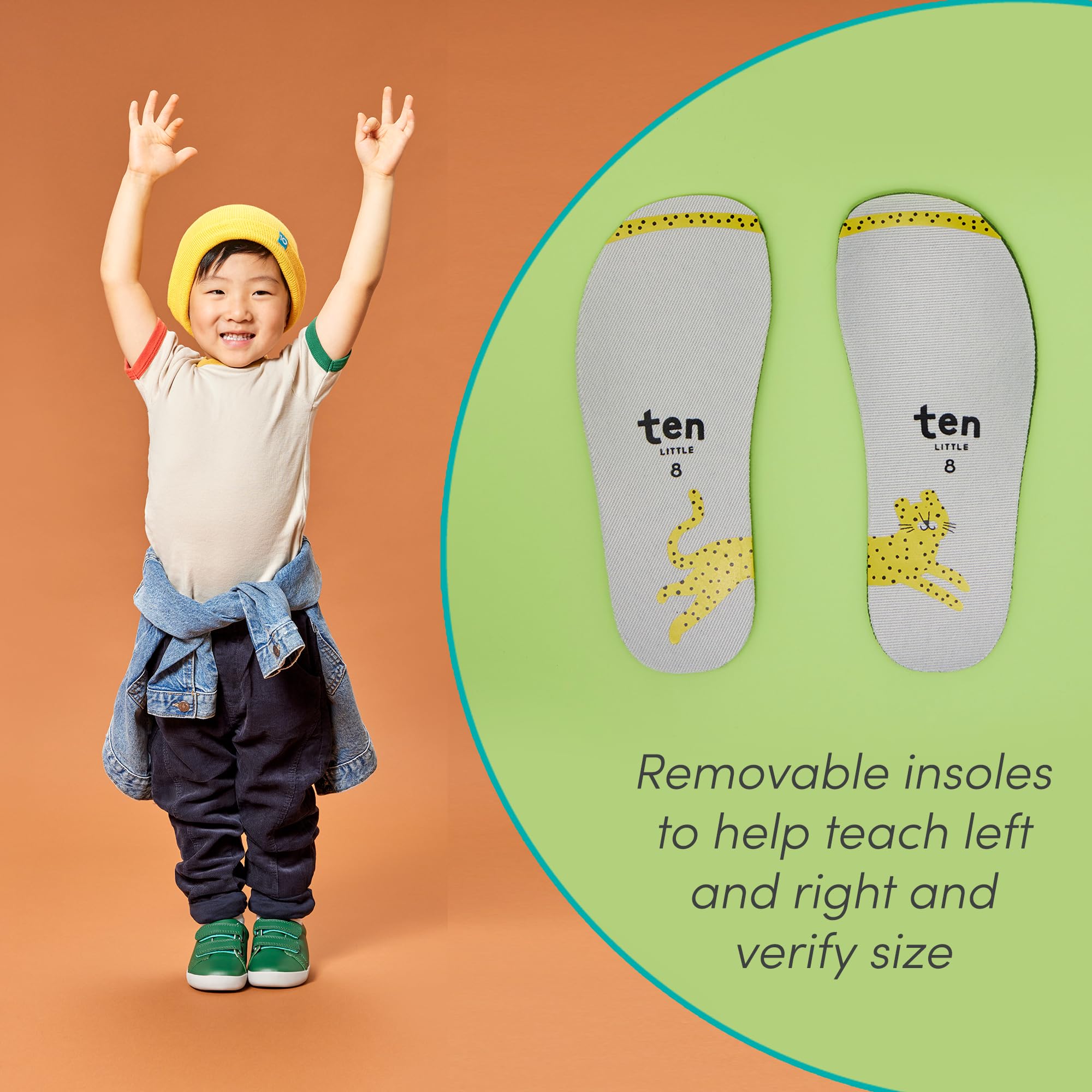 SIZE UP - Ten Little shoes may run smaller than mass brands due to our proprietary shape designed for healthy development. You may need a larger size! Scroll down to view our Size Guide and tips on how to measure your little one’s feet.