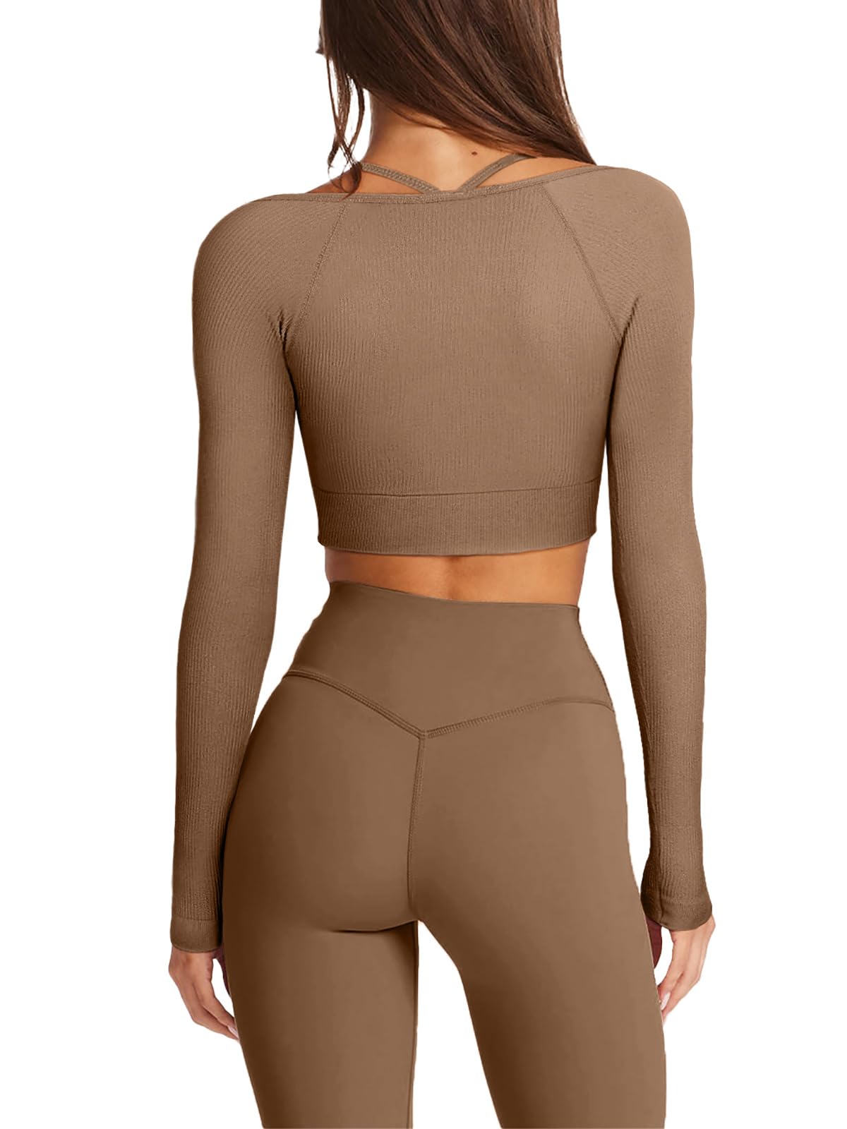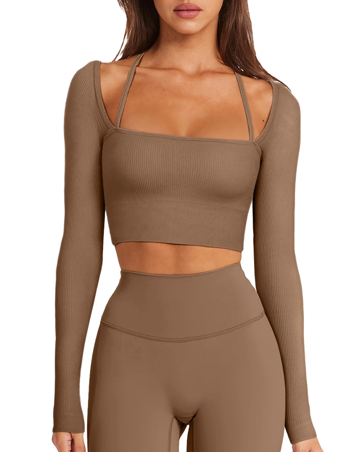 Design:Designed in wide neckline and halter neck,elegantly exposes the collarbone, adding a touch of sexy glamour to the women's crop tops.If you wear a bra with straps on a regular square neck top, it will show through. This long sleeve workout tops is the perfect solution to this problem.