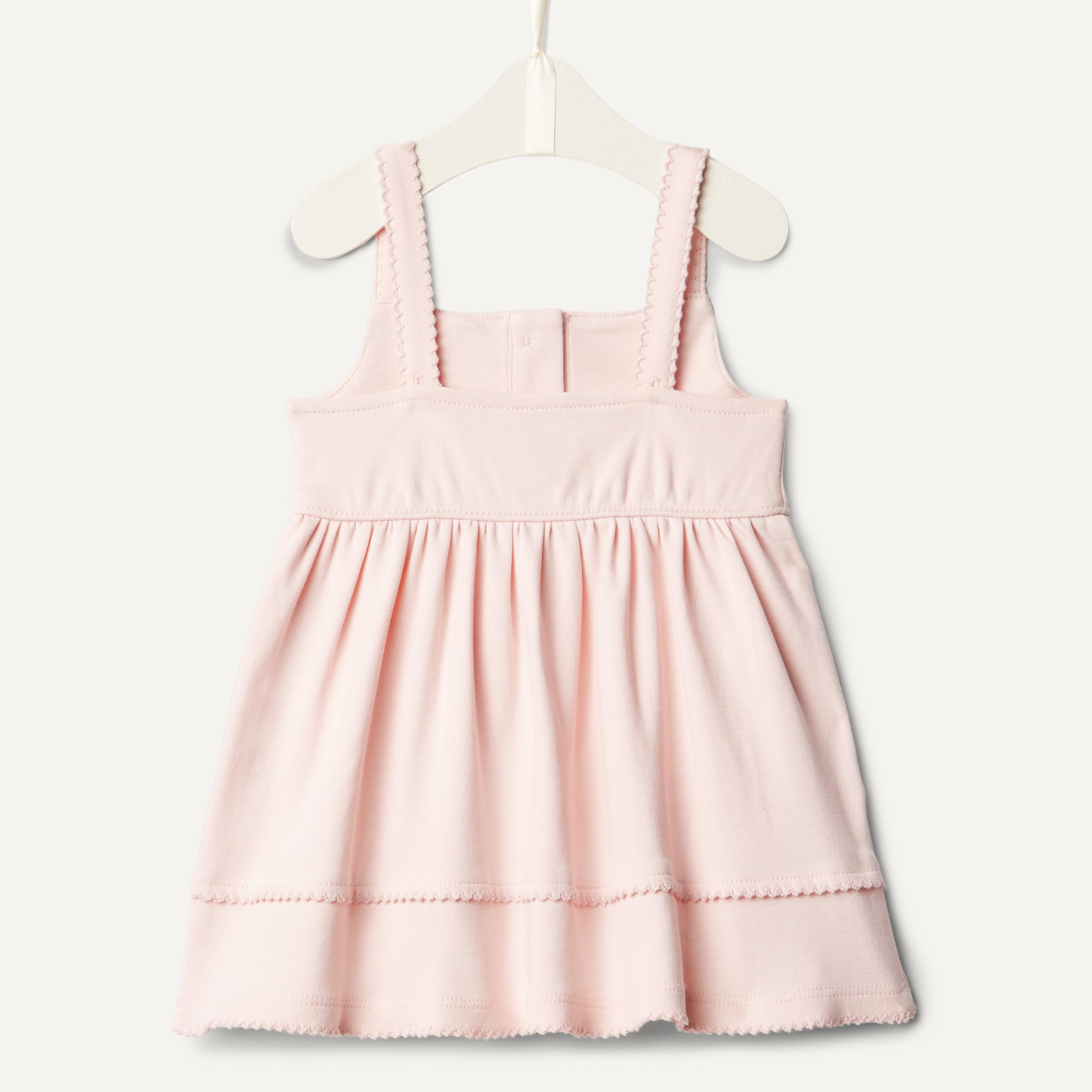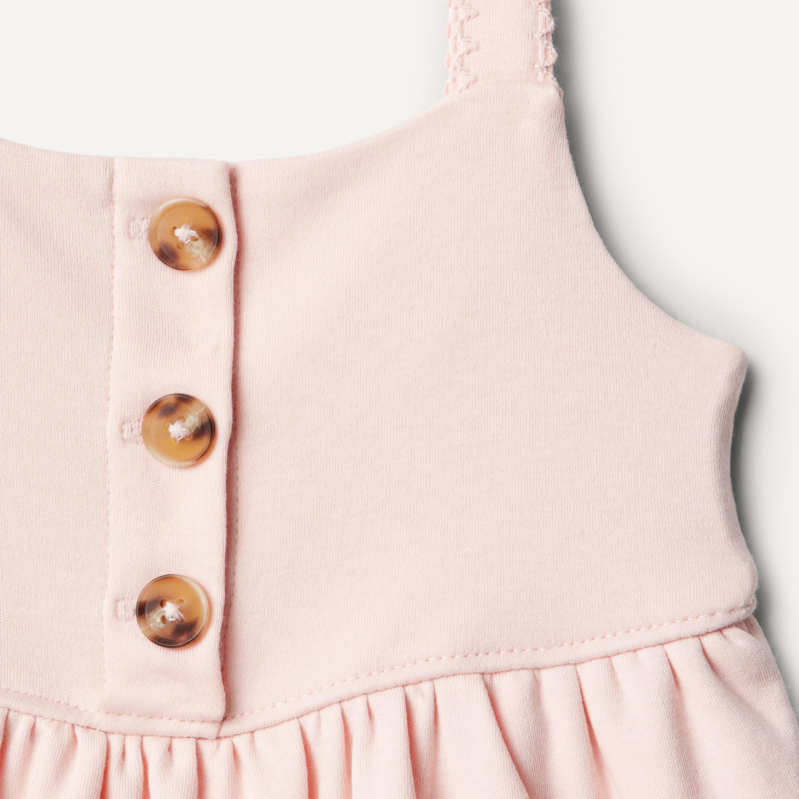 DETAILS: Button front placket, wide straps with interior buttons for adjustability, embroidered edge detailing on the straps and hem, and an elastic waist for added comfort