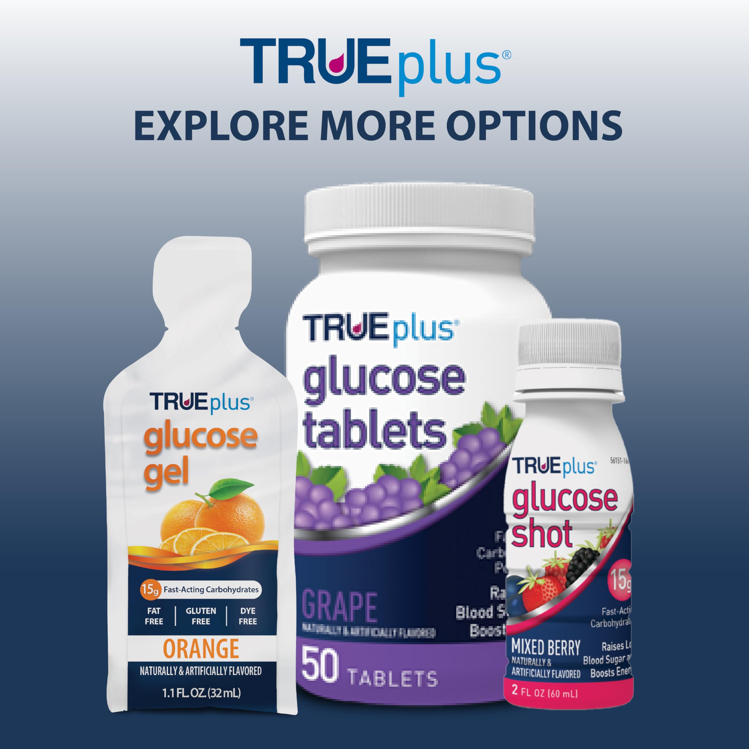 Part of a Full Line of Glucose Products: TRUEplus offers glucose gel packs, glucose tablets and glucose shots, trusted products for helping to manage low blood sugar and energy