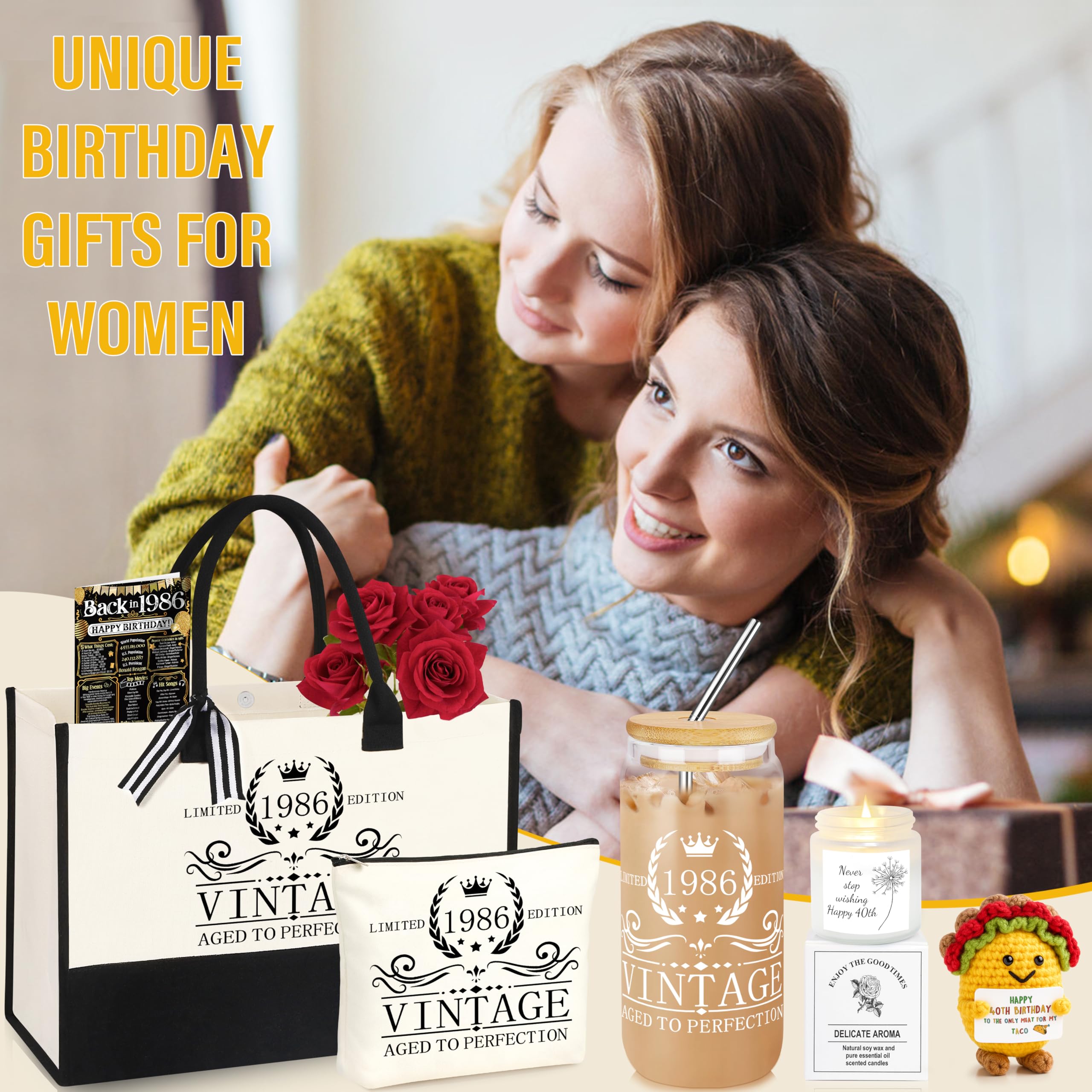 【40TH BIRTHDAY GIFTS FOR HER】: This set of 40th birthday gifts includes: 1 X 1986 tote bag, 1 X makeup bag,1 X 1986 can glass, 1X 40th taco crochet, 1X 1986 scented candle and 1 X 1986 poster. The unique canvas handbag set will be a cute gift for women's 40th birthday. The idea of a 40th birthday gift is the perfect choice to make her smile on their special day. 40th birthday gift, 40th anniversary commemorative gift, 40th wedding commemorative gift
